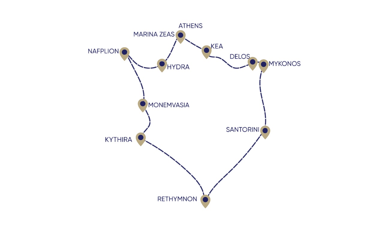 Enjoy a harmonious balance between conventional cruising and private yachting, along with an exciting voyage of discovery, unraveling the wonders of Classical Greece. The beautiful Cyclades, Kea, Santorini, Mykonos, and the neighboring UNESCO-protected archaeological isle of Delos. Crete, the largest and southernmost Greek island. The crystal blue waters of the island of Kythira, are a hidden gem of the Aegean sea. The Peloponnese with Monemvasia and Nafplion historical treasures.