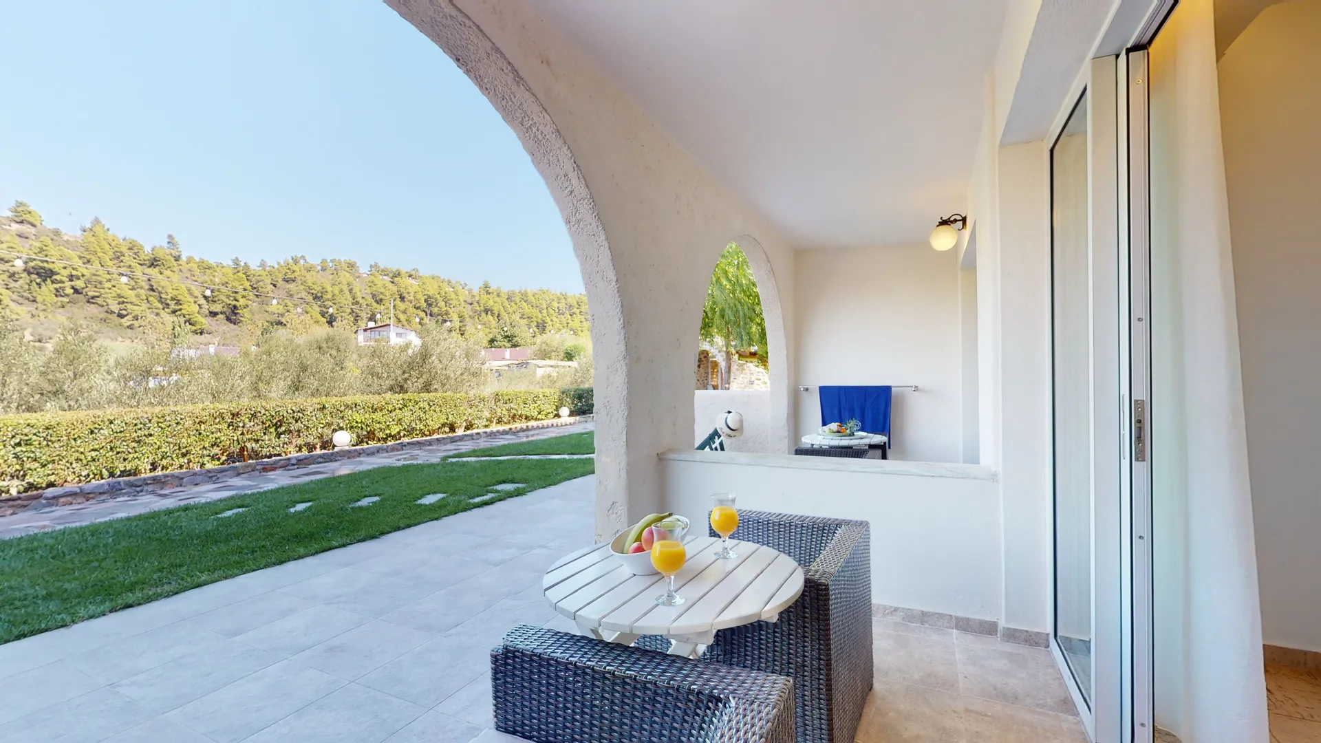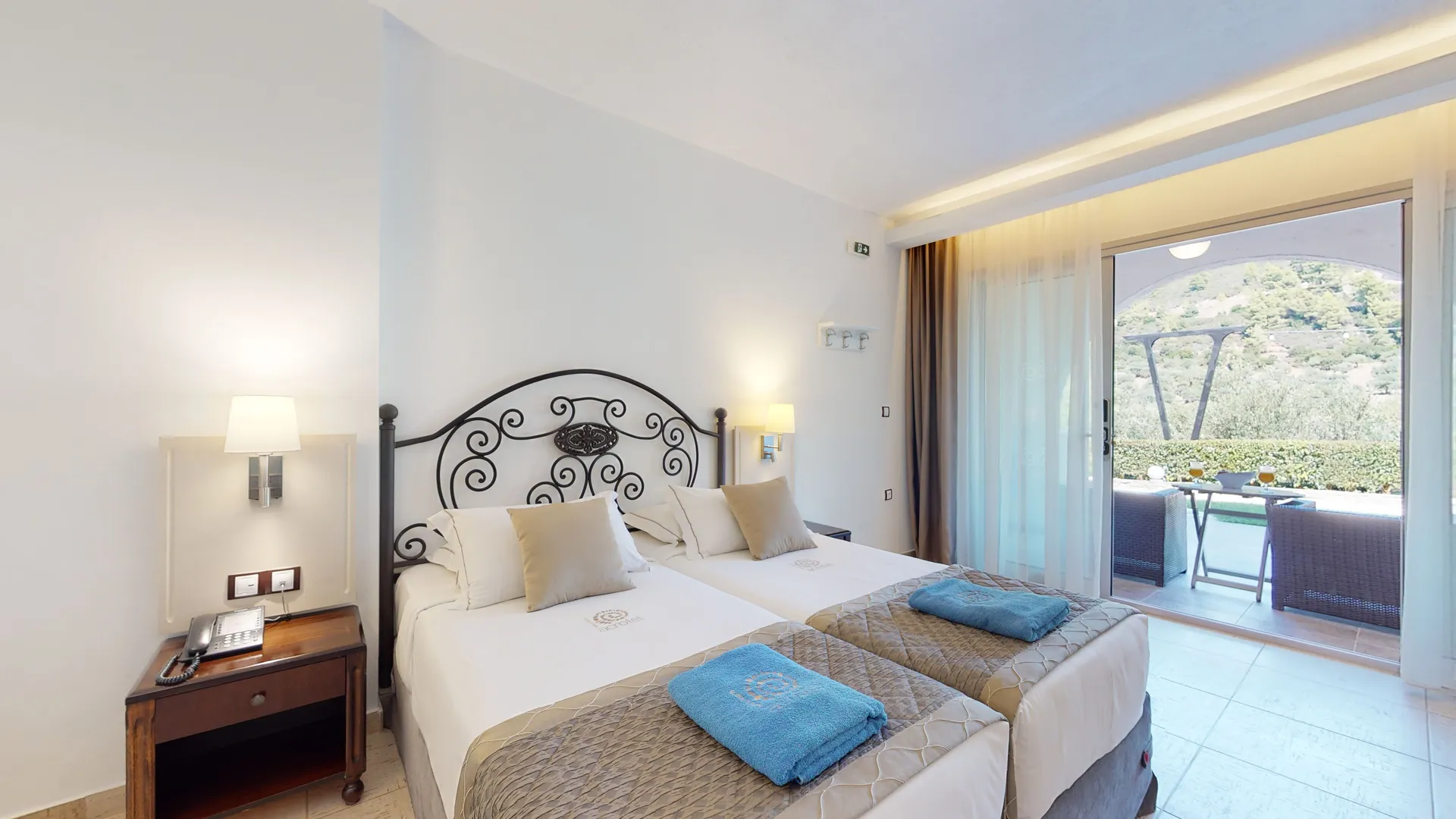 The suite features a terrace with a garden or mountain view, providing guests with a tranquil and scenic environment to relax in. The suite also includes two air conditioners for added comfort, along with two satellite TVs, a radio, and an internet line. Guests can stay connected and entertained during their stay. Other in-room amenities include a direct-line telephone, a refrigerator/mini bar, a safe box, and a WC with a shower. Guests can also enjoy the convenience of bathrobes, a hairdryer, and daily maid service.
