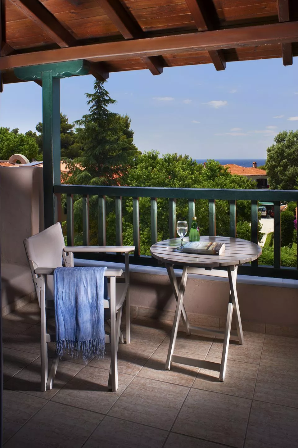The room boasts a private balcony with either a garden, mountain, or sea view, providing a perfect place to unwind and enjoy the beautiful surroundings. The room is equipped with air conditioning, ensuring guests can stay comfortable during their stay.