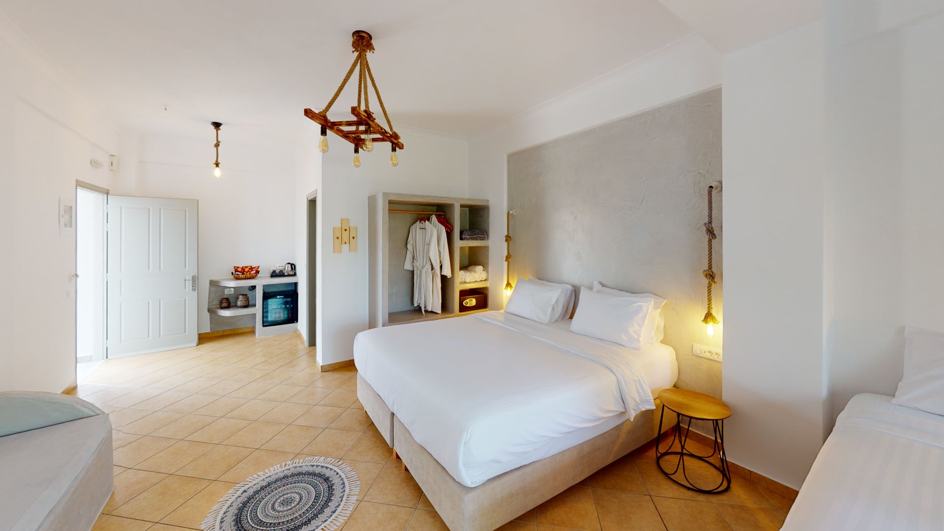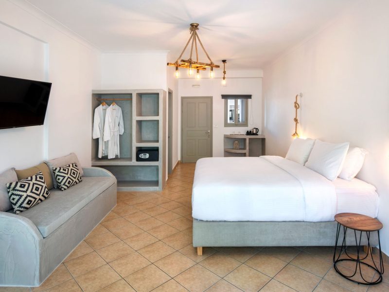 This Kalya Suites & Rooms has a bohemian-luxe design, keeping the local Cycladic architecture mixed with cosmopolitan features which makes it a very chic and relaxed environment.