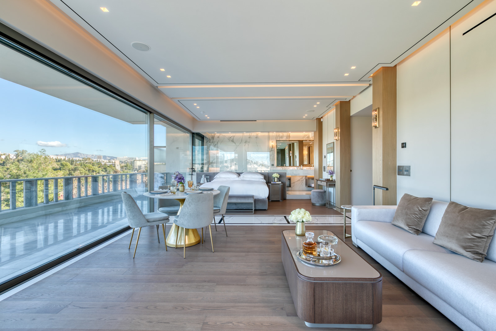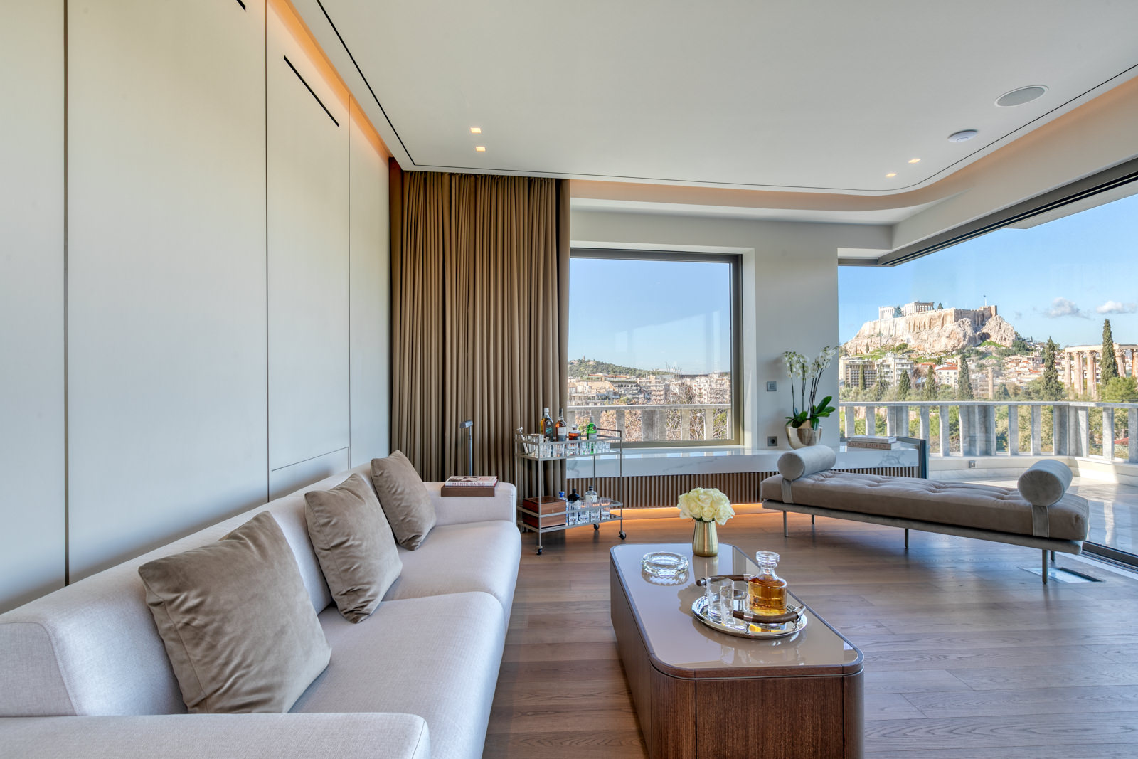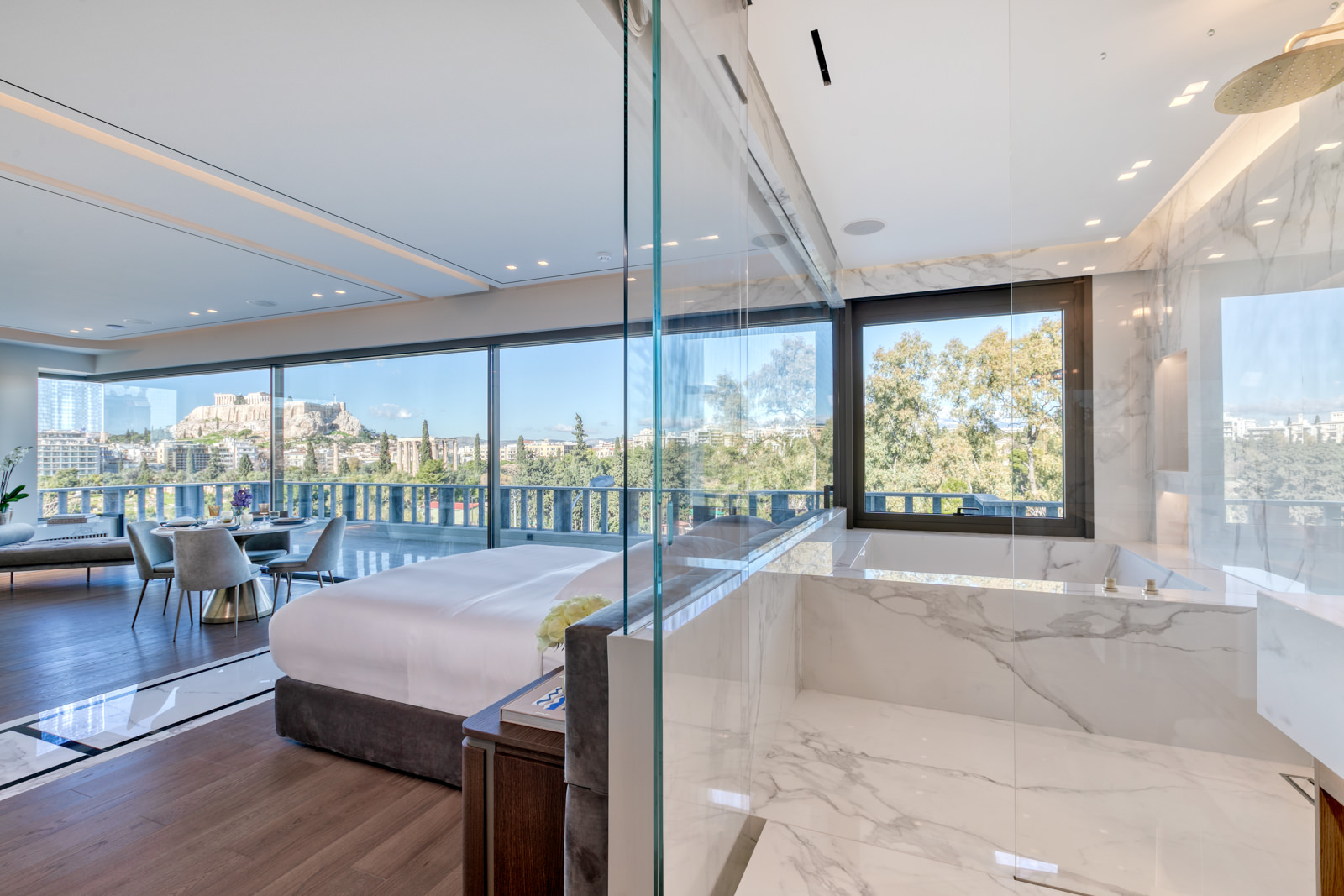 Step through the frameless sliding glass doors and onto the private balcony, which spans an expansive 30 sqm of marble floor. Here, immerse yourself in breathtaking vistas of the Acropolis, Mount Lycabettus, the Temple of Olympian Zeus, and the National Garden.