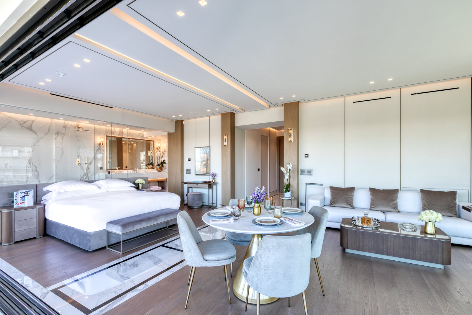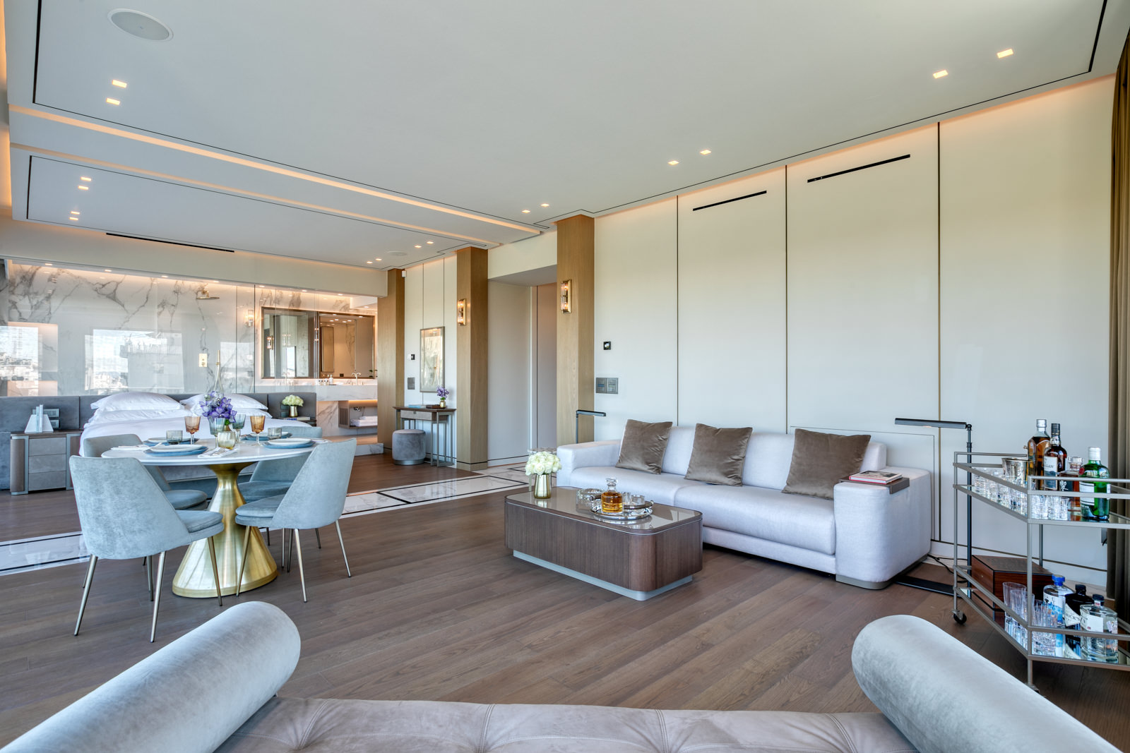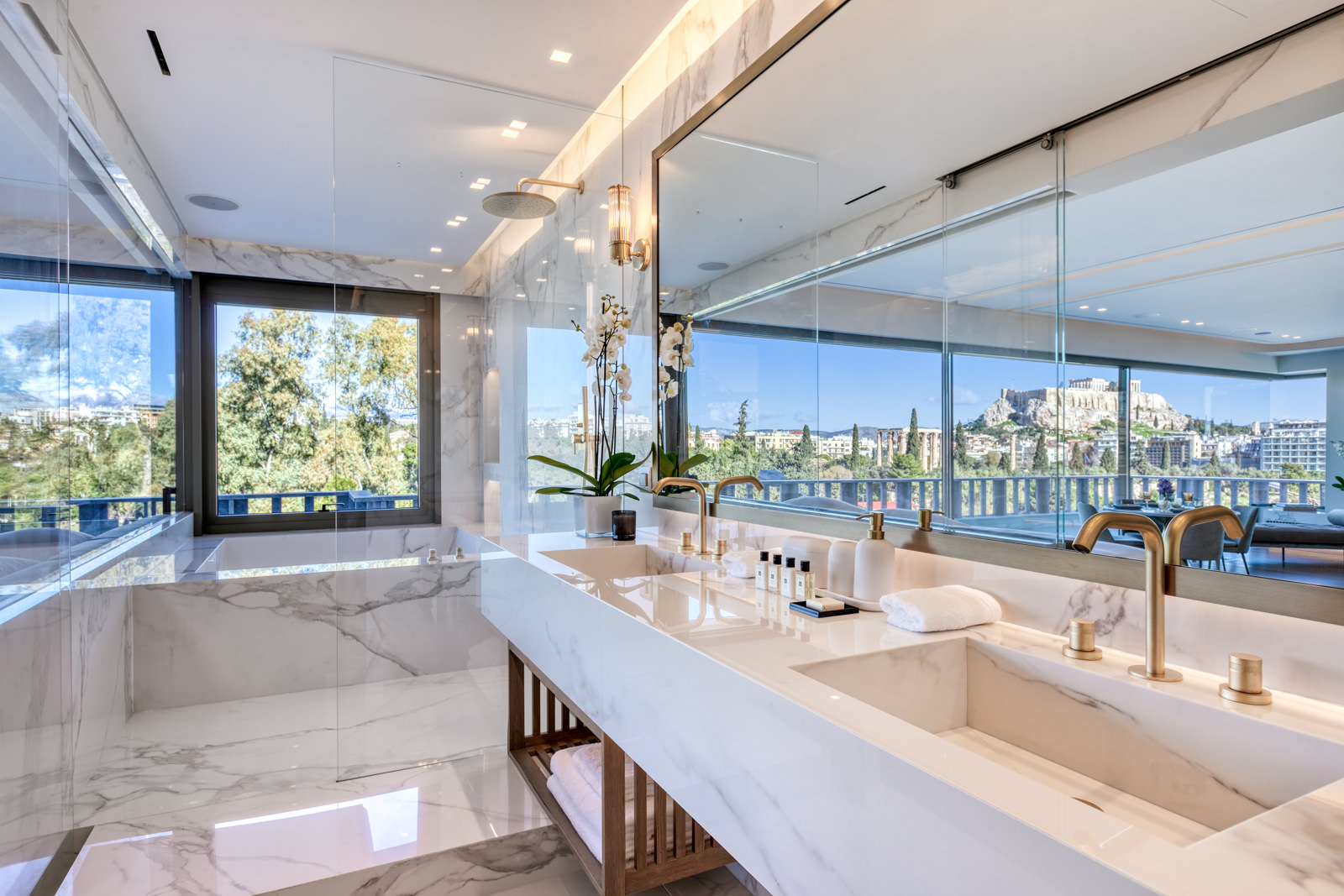 Step through the frameless sliding glass doors and onto the private balcony, which spans an expansive 30 sqm of marble floor. Here, immerse yourself in breathtaking vistas of the Acropolis, Mount Lycabettus, the Temple of Olympian Zeus, and the National Garden.