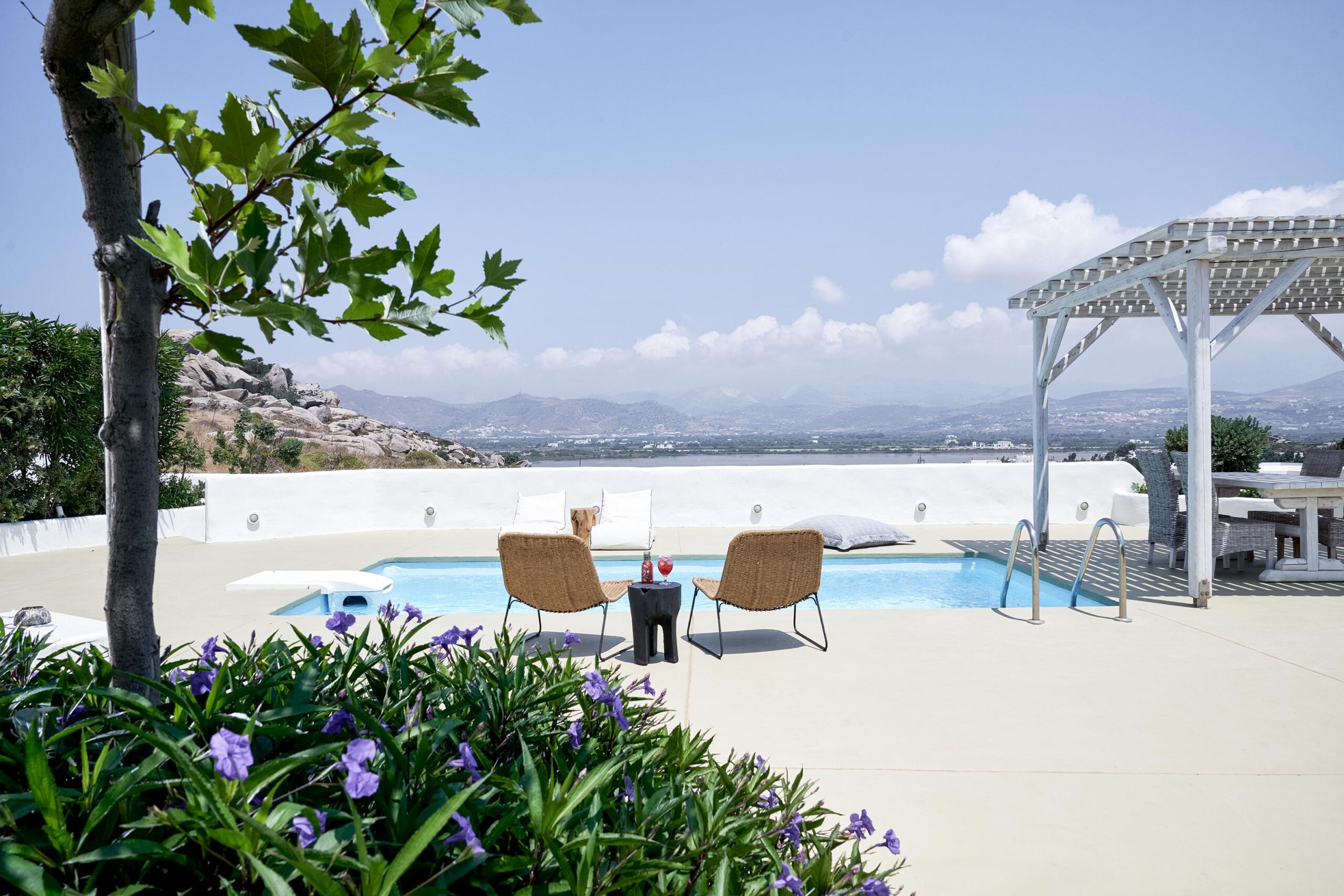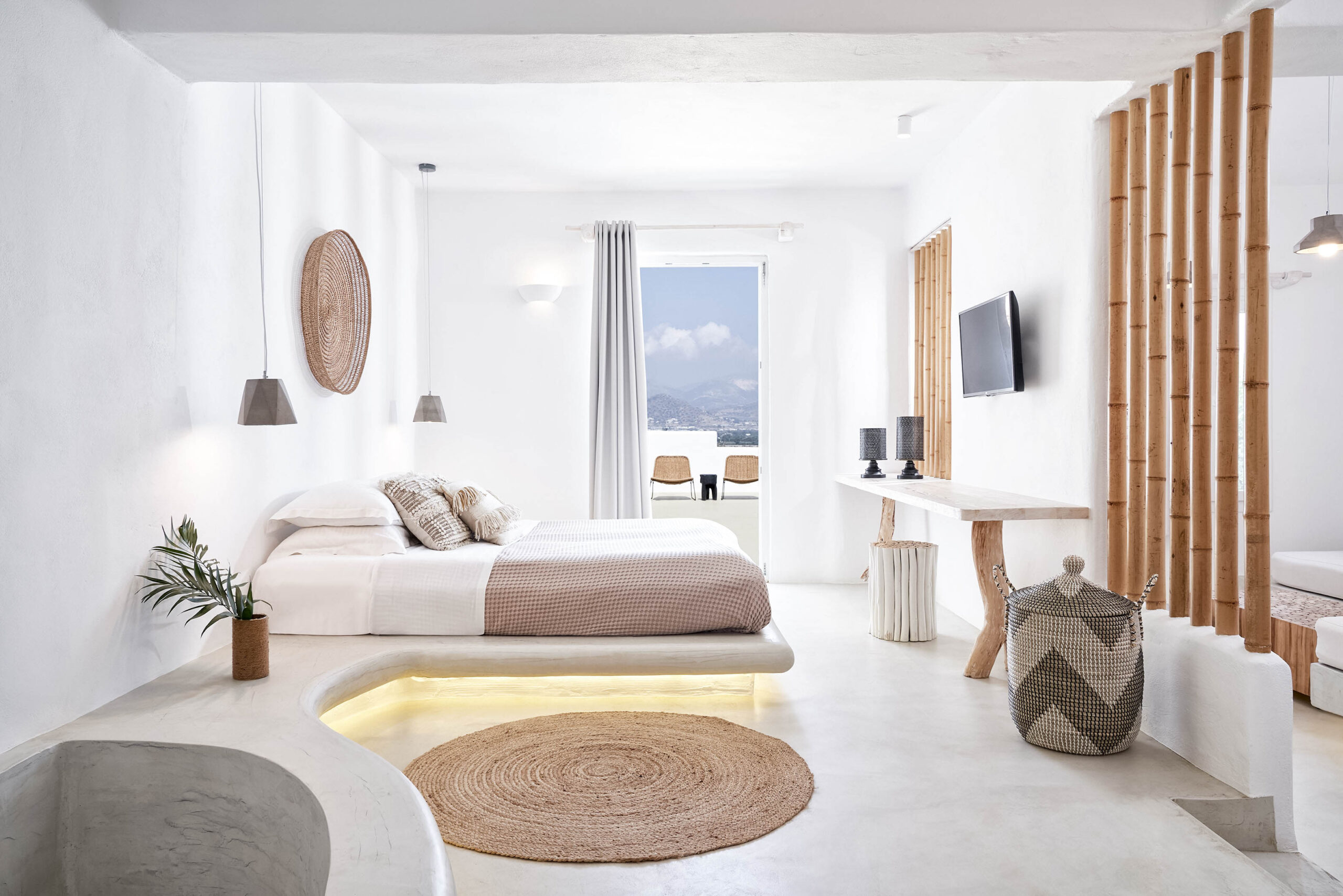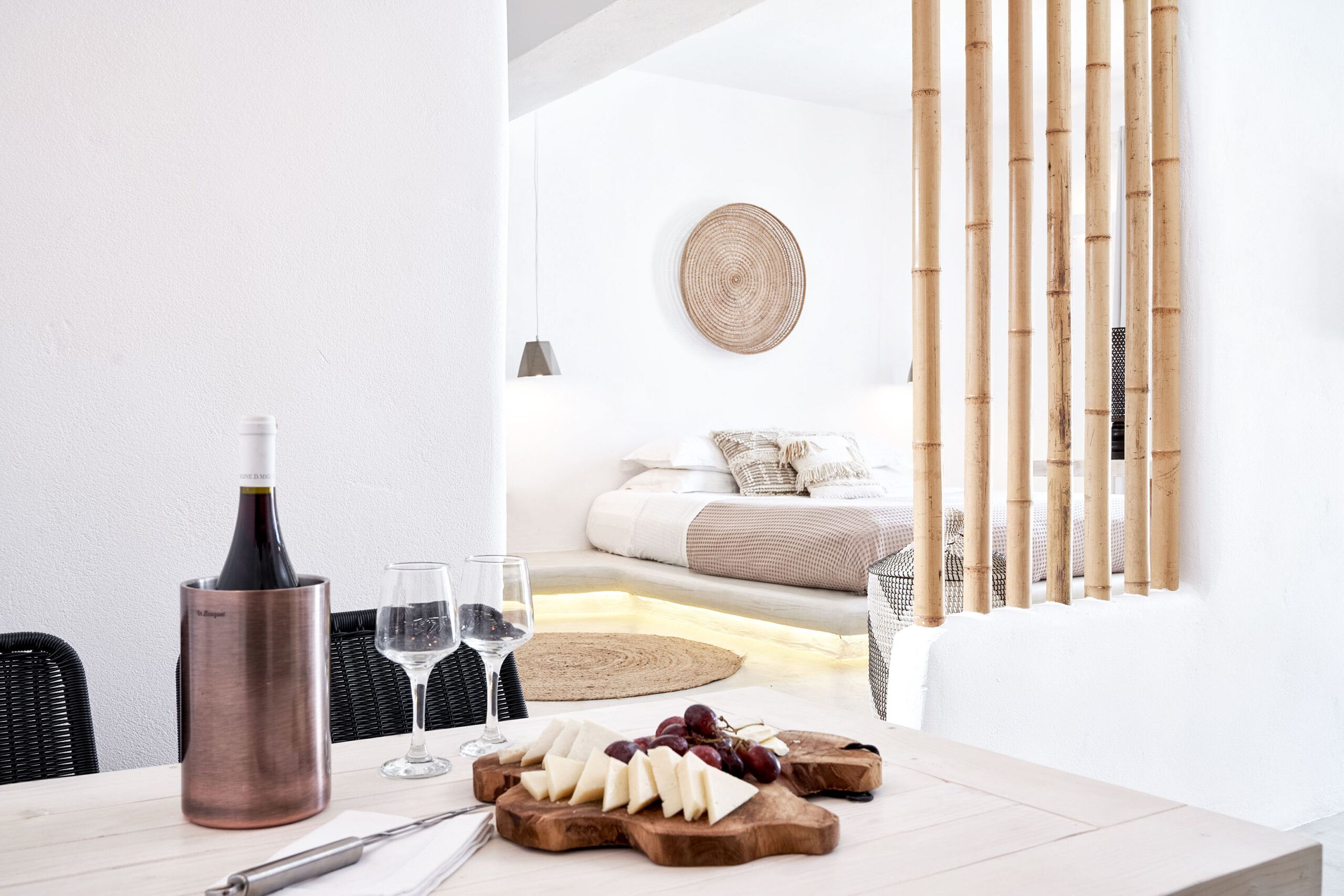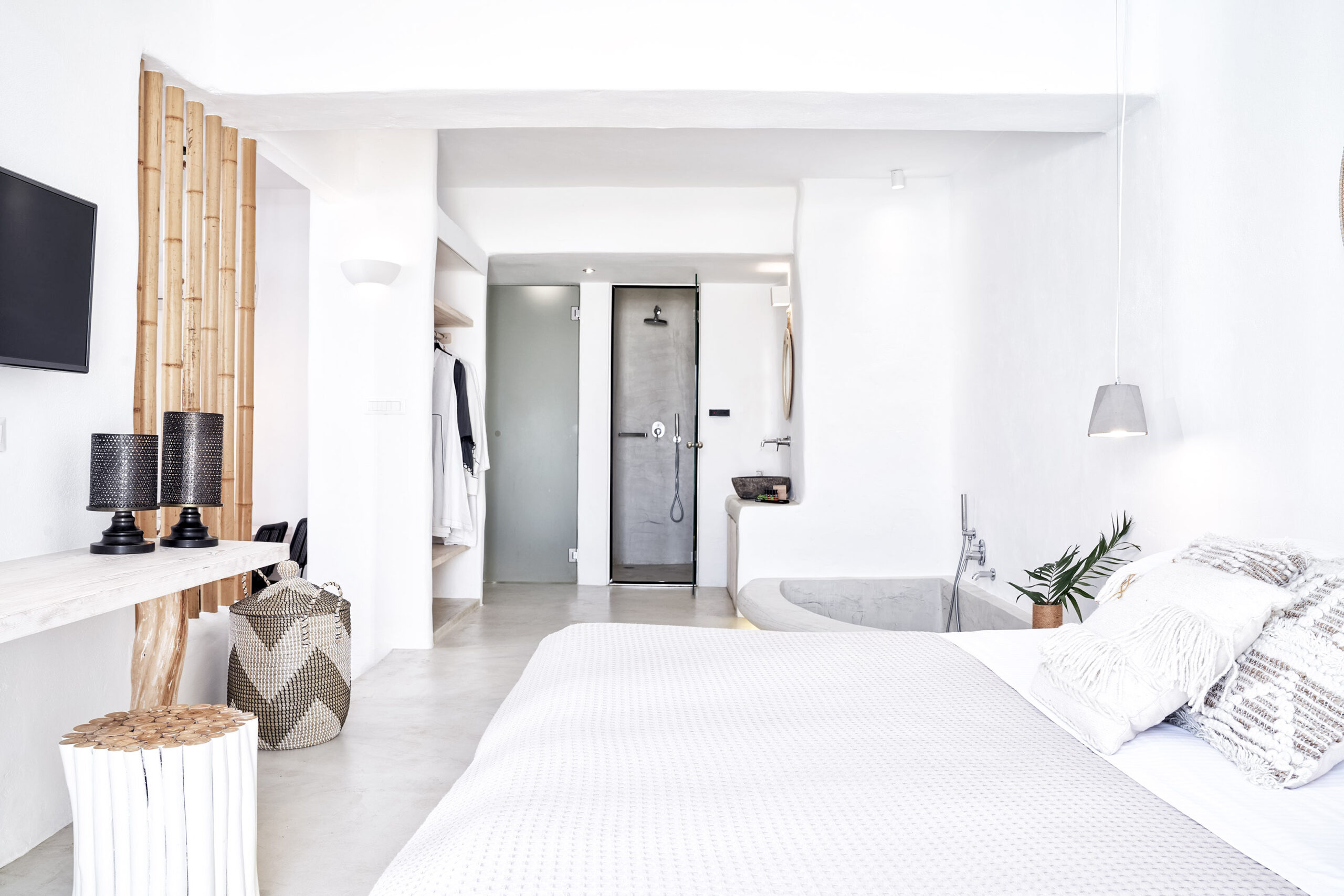 The Naxian Utopia Spa Suite in Naxos is a luxurious and aesthetic suite of 62sqm, that features a private pool in a 95sqm patio area. They can accommodate up to 4 people, with 1 bedroom, 2 sofa beds, and an open plan bathroom and private toilet.