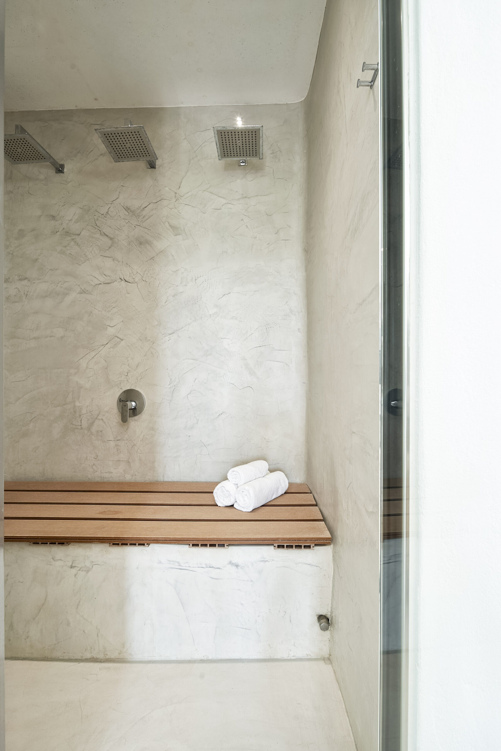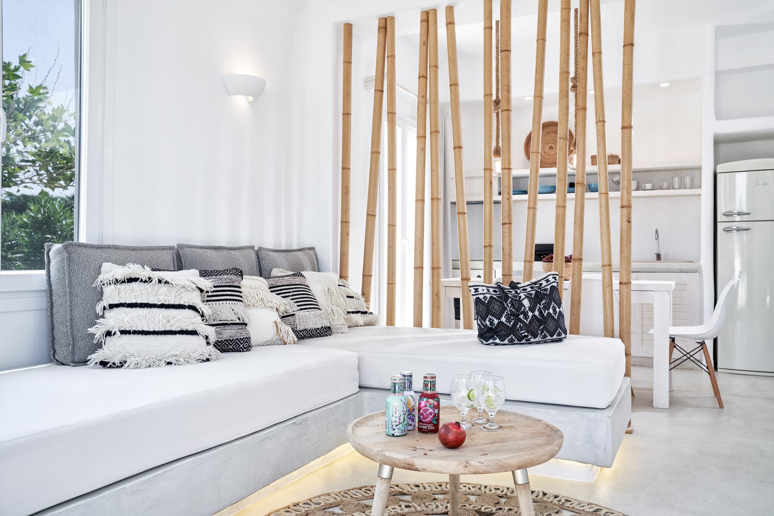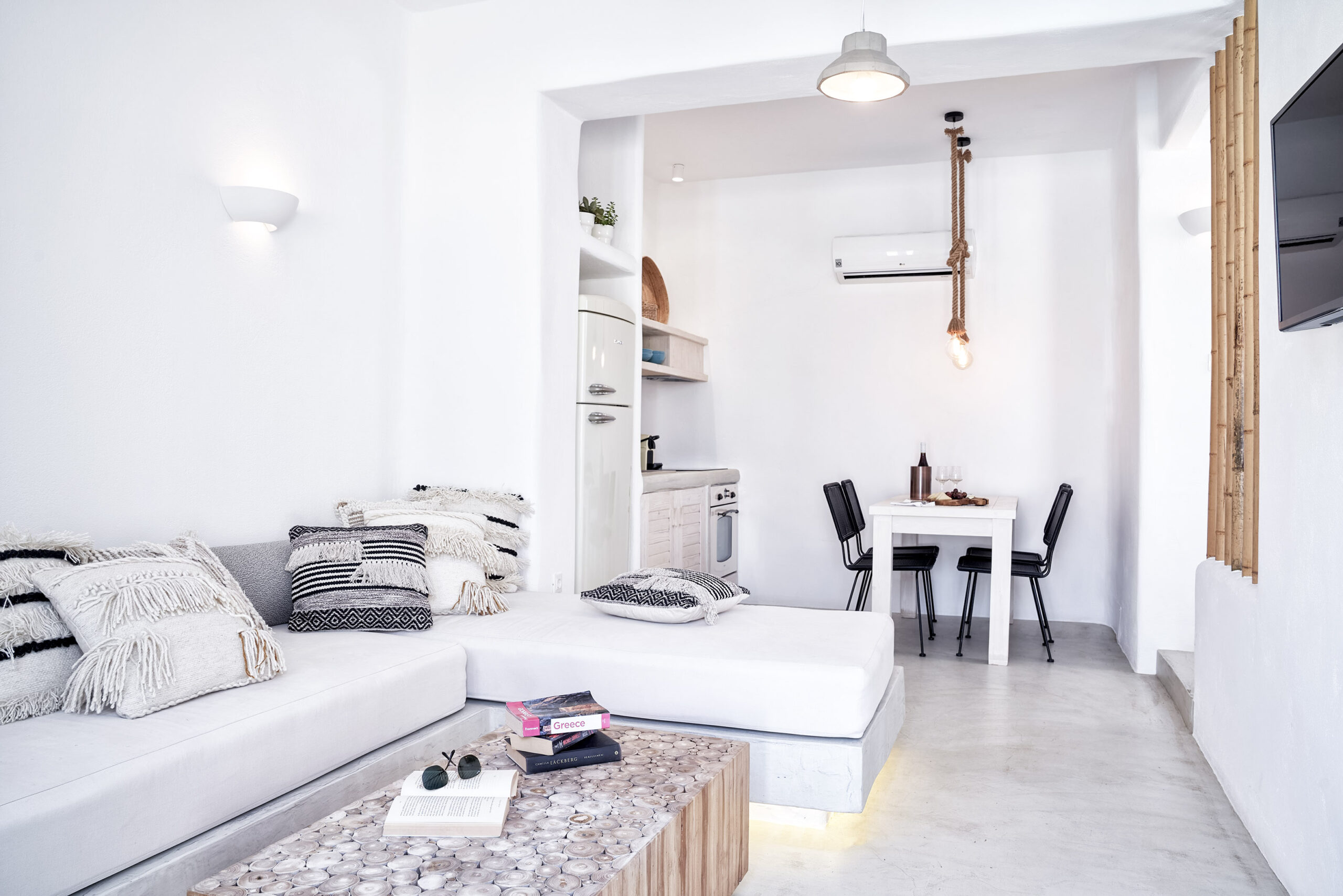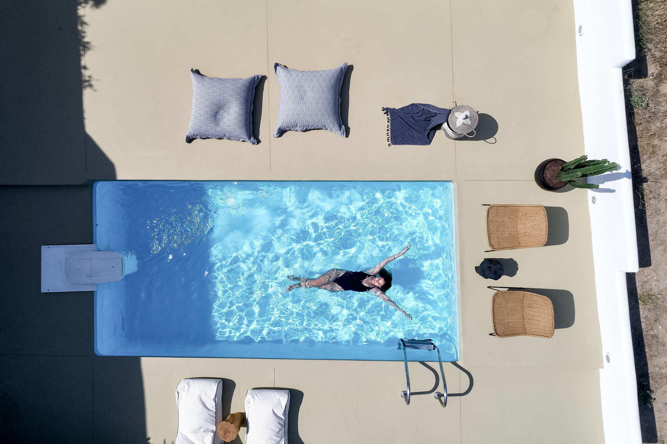 The Naxian Utopia Spa Suite in Naxos is a luxurious and aesthetic suite of 62sqm, that features a private pool in a 95sqm patio area. They can accommodate up to 4 people, with 1 bedroom, 2 sofa beds, and an open plan bathroom and private toilet.