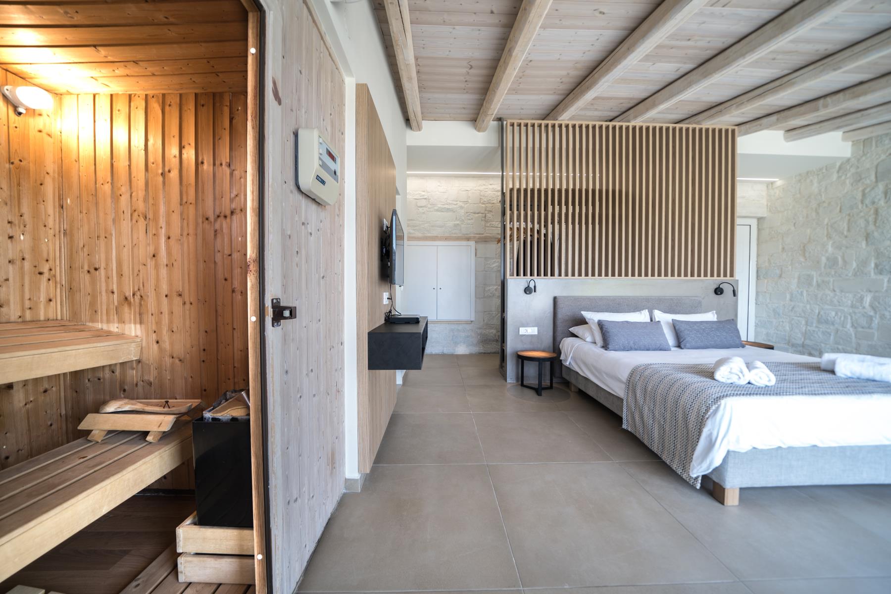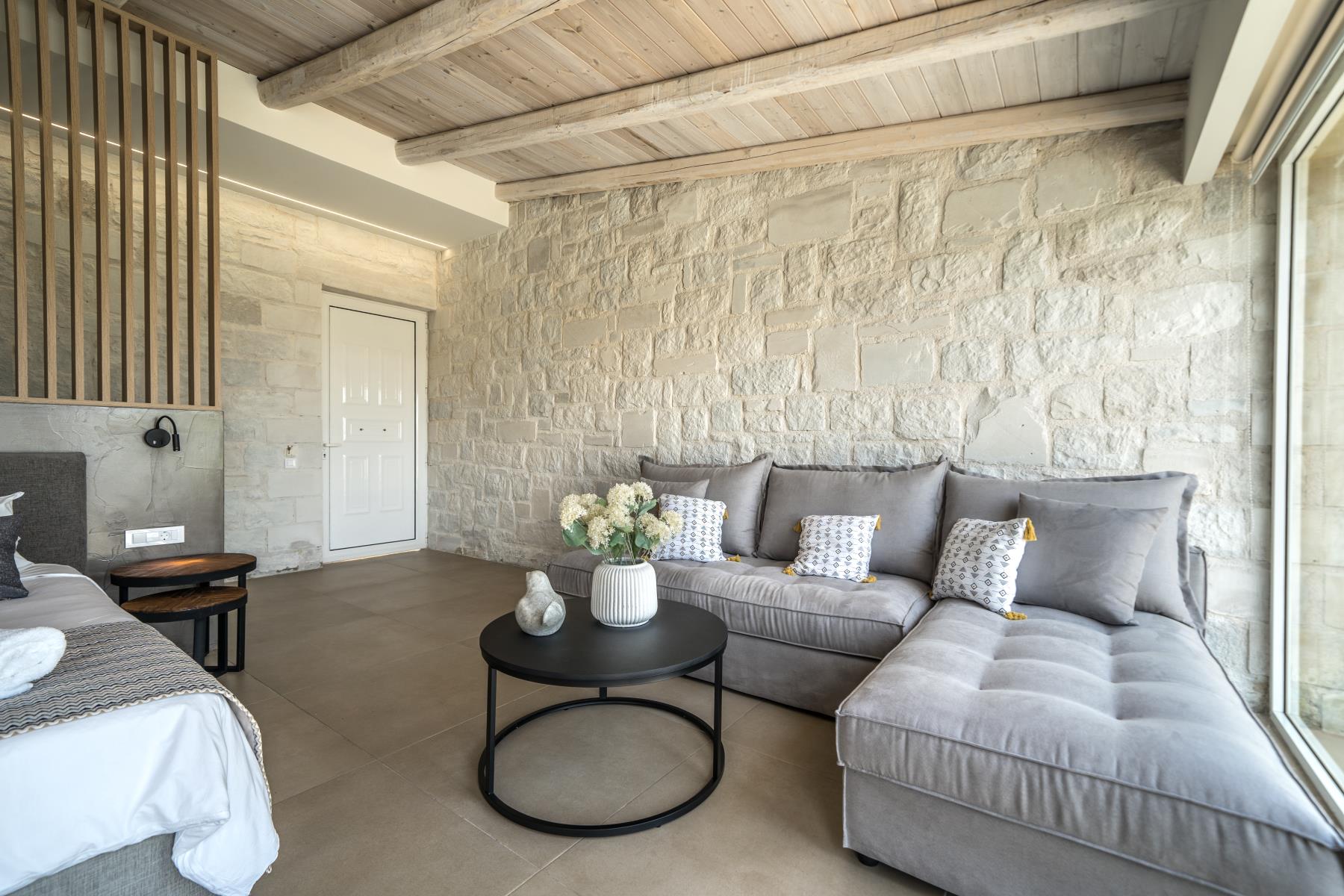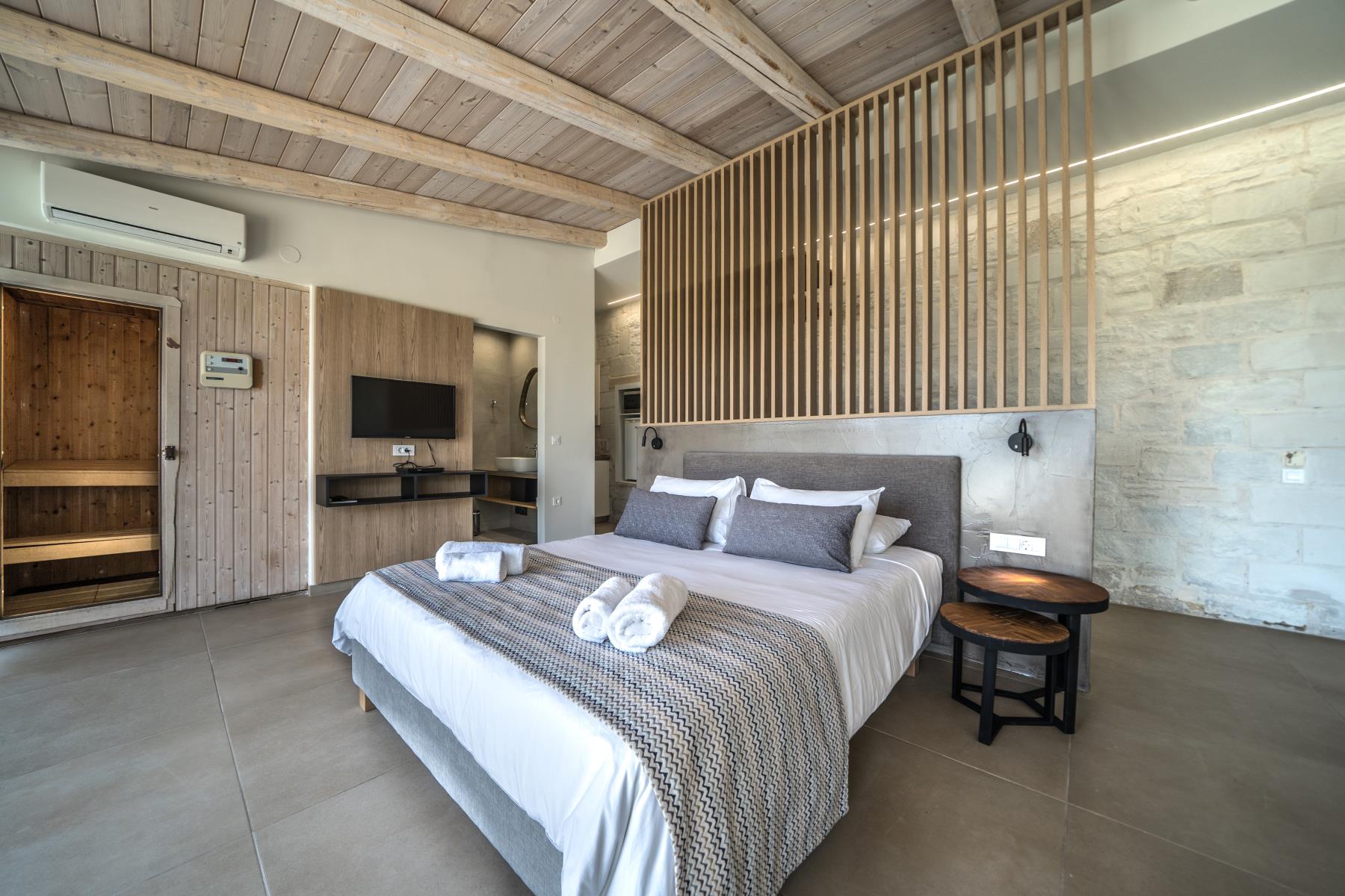 The architecture of Lycea Suite is a fusion of traditional elements of stone and wood, blended with modern design. The suite features a spacious and well-appointed living room, a fully-equipped kitchenette, a luxurious bathroom, and a private garden with a jacuzzi. The sauna is also available to guests to help them unwind and relax after a long day of exploring.