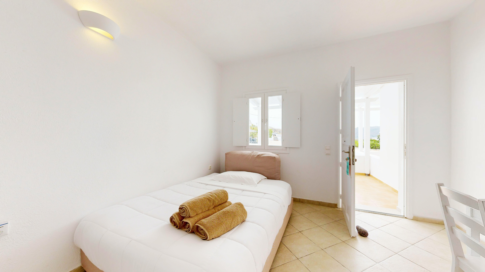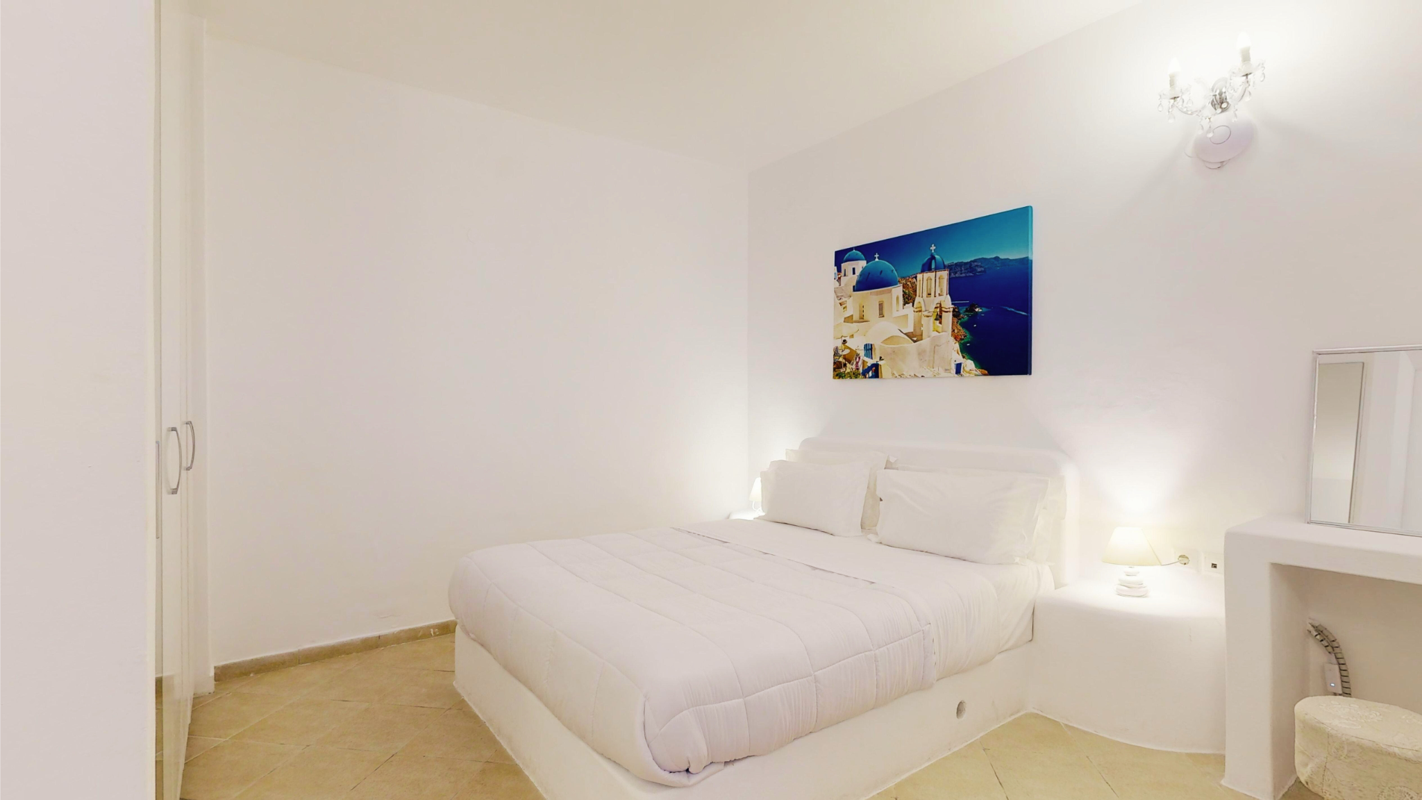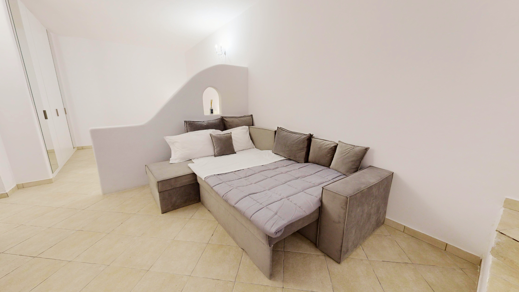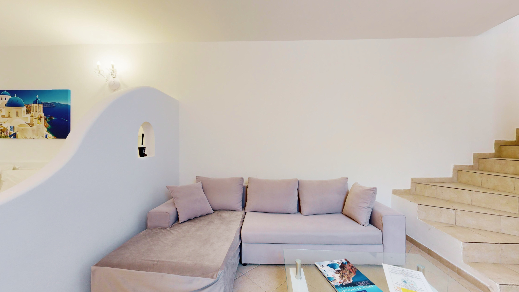Nestled on the peaceful outskirts of Oia, Santorini, Mirante Villas is a collection of six identical luxury villas, each offering a seamless blend of Cycladic elegance and modern comfort. Each villa spans two levels, featuring a fully equipped kitchen, dining area, and a cozy living space on the main floor. The lower level houses a serene bedroom with a queen-size bed, ample storage, and an additional sitting area. Additionally, each villa includes two sofa beds, making it ideal for families or small groups. Modern amenities include individually controlled air conditioning, satellite LCD TV, complimentary Wi-Fi, and luxurious toiletries, ensuring a comfortable and indulgent stay.