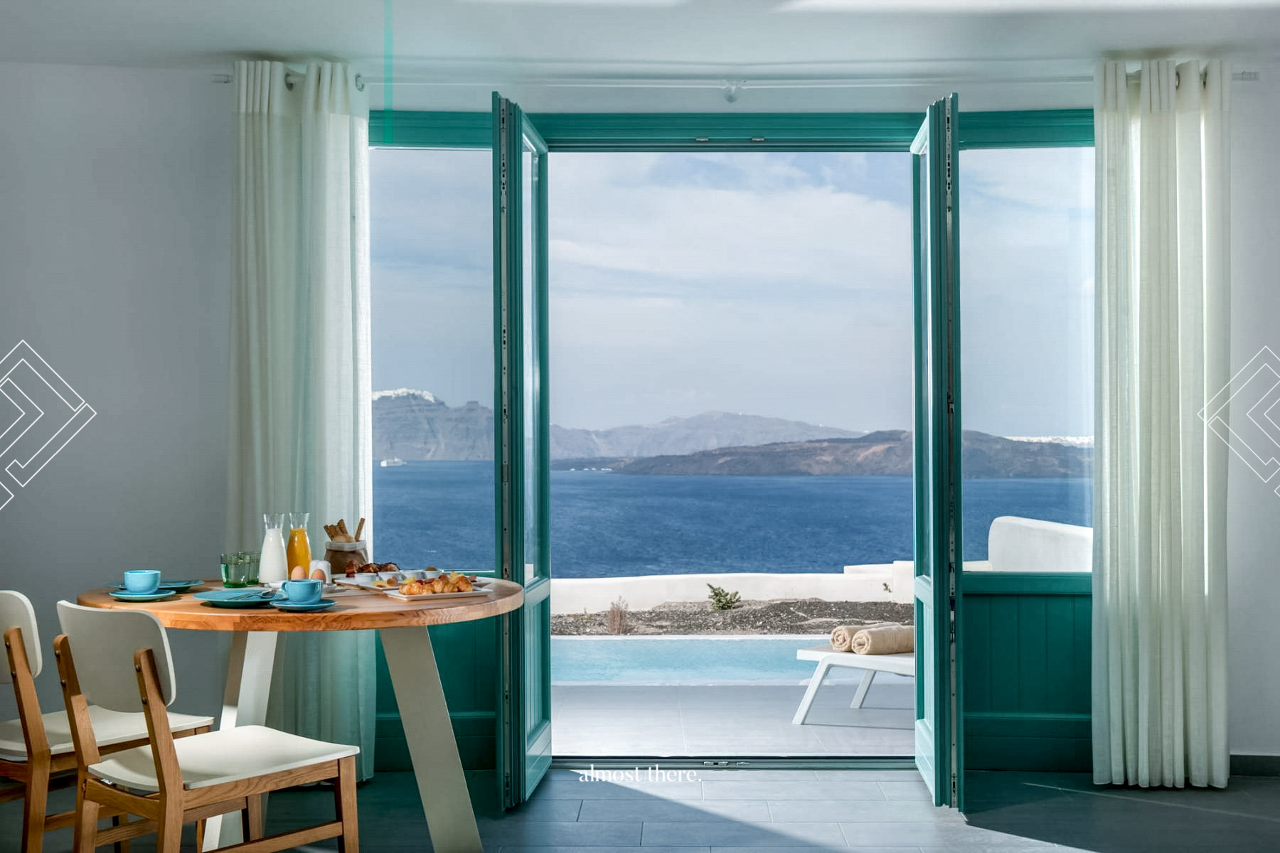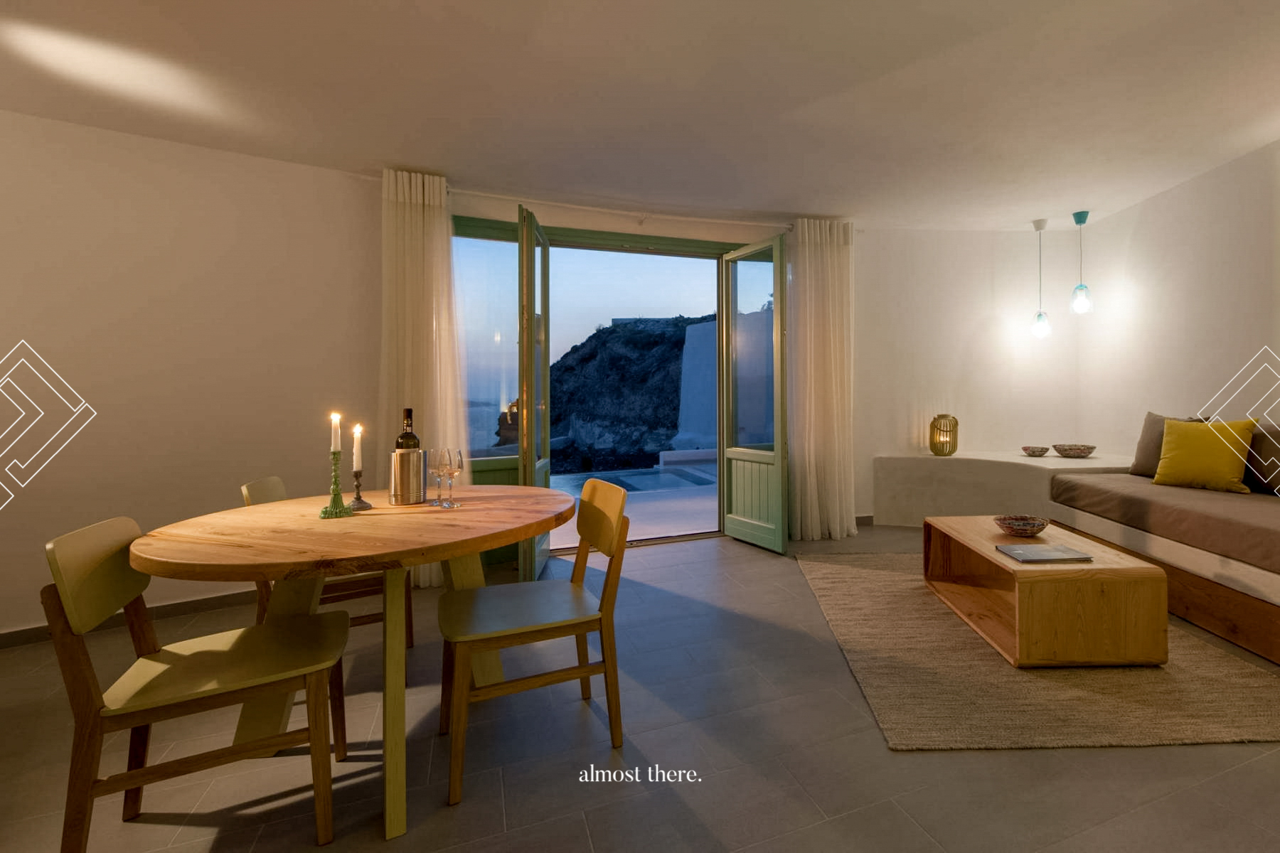 Upon entering the suite, guests are welcomed to an open space living room/bedroom area with high-quality furnishings and tasteful décor. The living room area is designed for ultimate comfort with a cozy couch, a round dining table, and a flat-screen TV. The couch can also be easily transformed into two single beds to accommodate two extra guests. The large window/door offers breathtaking views of the iconic Caldera, providing a sense of serenity and tranquility.