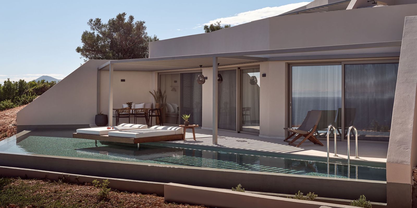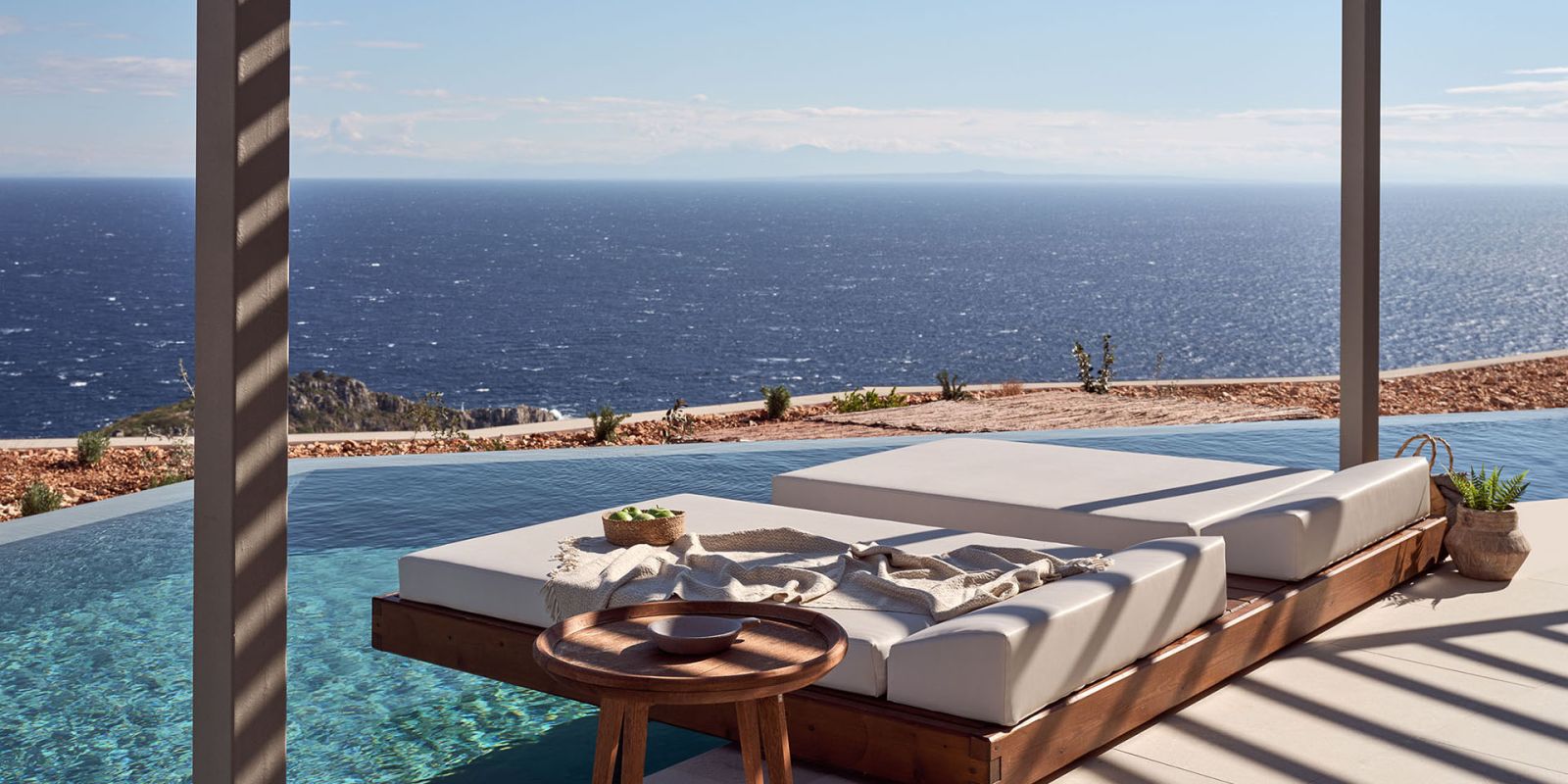 With a spacious area of approximately 60 m2, this Superior Suite offers a cozy and relaxing ambiance for its guests. The Suite comprises two bedrooms furnished with king-size beds, two separate bathrooms with luxurious amenities, and a crib upon request. The elegant bedroom leads to a luxurious bathroom, while the living room provides access to a fully equipped kitchen and a work-from-anywhere station. The Suite’s private patio is the perfect spot to unwind and bask in the awe-inspiring view of the Ionian Sea and the nearby island of Kefalonia. Visitors can relax in the Suite’s private pool or on one of the four sunbeds available. An outdoor shower and a dining table complete the “outdoor-living” atmosphere, providing guests with an exceptional al fresco dining experience.