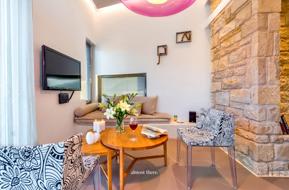 Villa Abyssos is a residential structure that boasts a unique architectural concept that sets it apart from other buildings. The villa comprises two separate buildings that are linked by a stone walkway, with the living and sleeping areas being in different structures. The living area is designed with modern architectural features, including natural stone finishes that extend to the roof’s eaves. The lounge is compact but stylish, with a Cimentogonia surface sofa bed that can comfortably sleep an additional person. The open-plan kitchen area is well equipped with top-of-the-range appliances and practical Corian work surfaces, as well as a casual dining area.