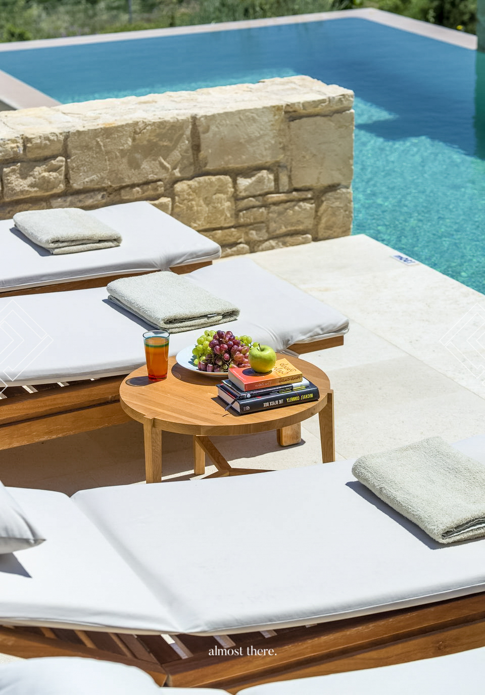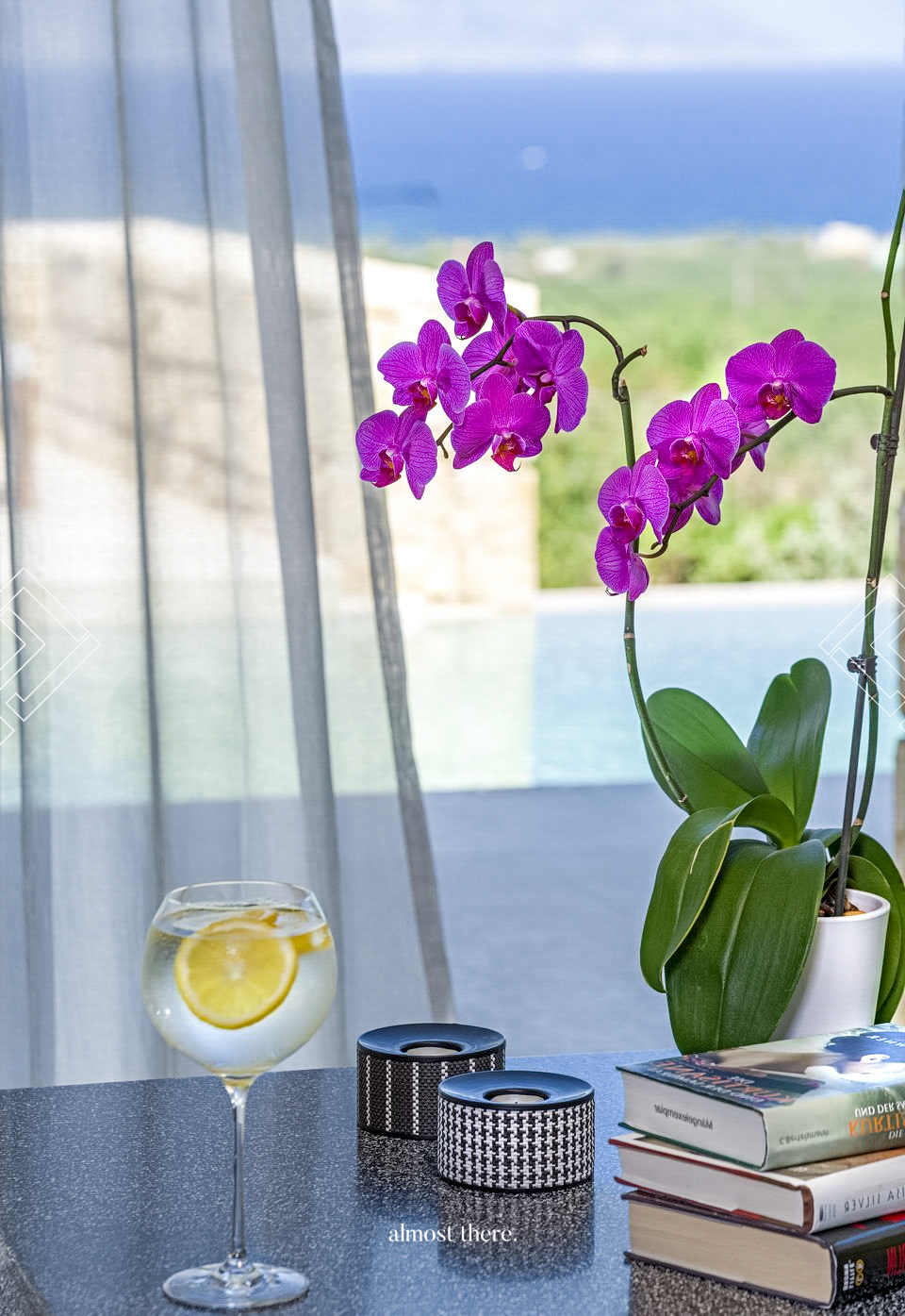 A characteristic Cimentogonia staircase leads to the first-floor master bedroom of Villa Dreams, which has a large front-facing private balcony. The wall-to-wall glazing provides uninterrupted views of the Aegean Sea’s blue waters, and the gracious en-suite open-plan bathroom allows guests to soak up the beautiful sea view while relaxing in the bath.