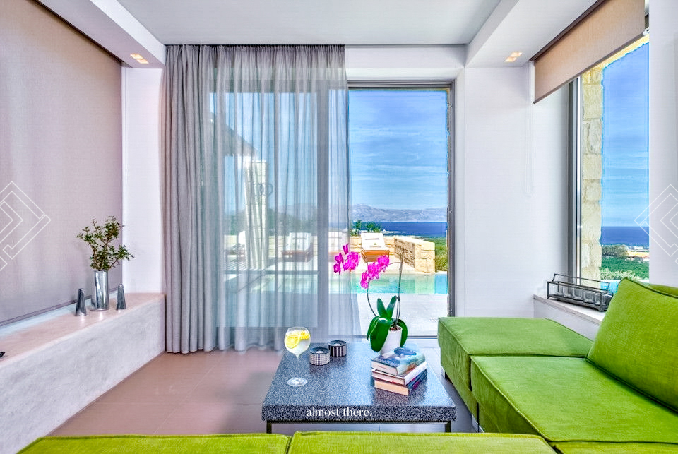 Access to the villa is through the ground floor, which opens to a modern and spacious living room with a clever combination of architecture and amenities. The open-plan kitchen area is designed with practical and stylish Corian work surfaces, top-of-the-range appliances, and an informal dining area.