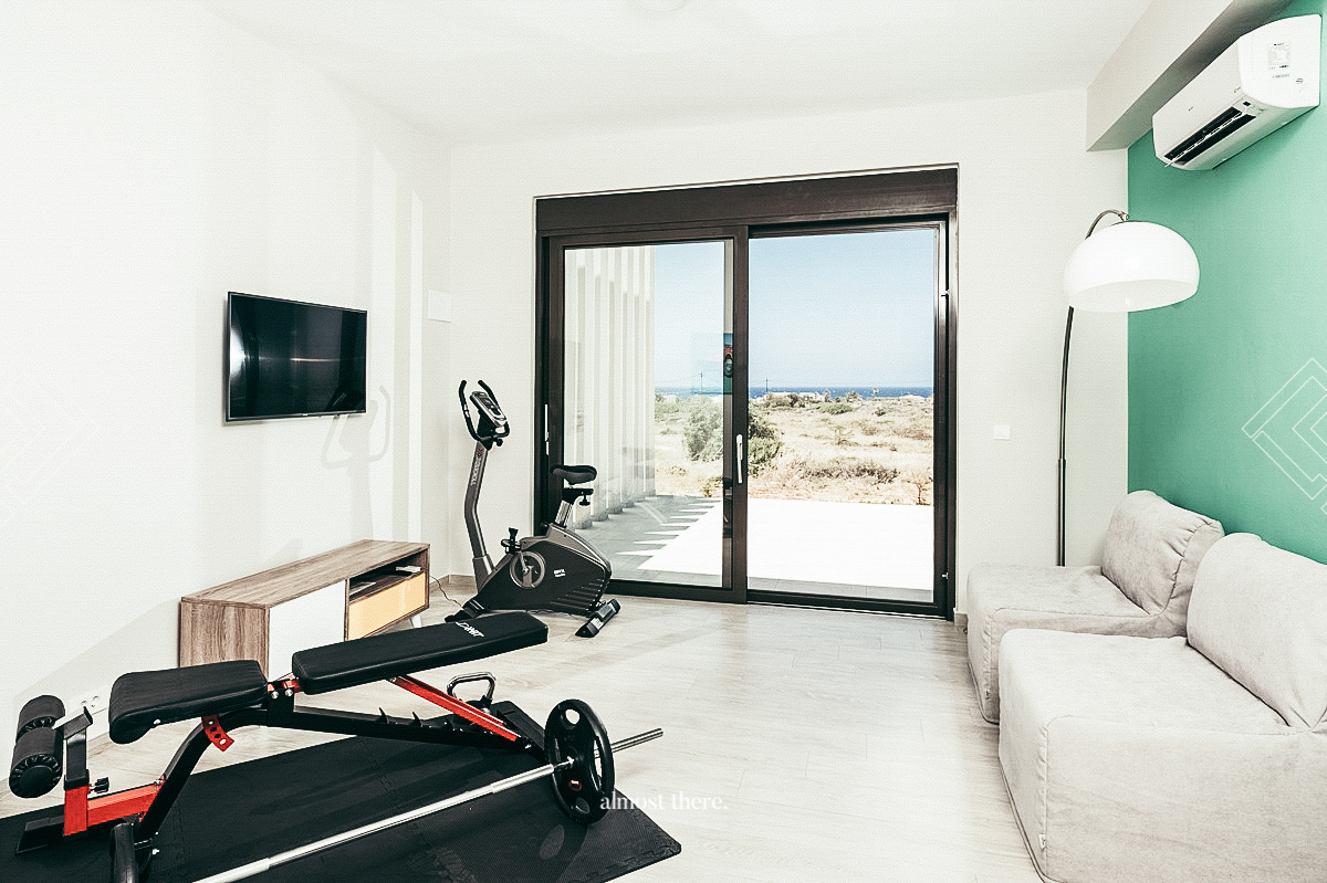 The villa’s main living space is designed to offer a seamless indoor-outdoor living experience. The living area extends to the outdoor patios, sun decks, sitting areas, and the pool. The 8-meter-long bay window, which offers a mesmerizing view of the sea, has been cleverly designed to open entirely and merge the interior and exterior living spaces. The modern interior features a designer corner sofa, a large flat-screen smart TV, a DVD player, and a dining table accommodating up to 8 people. A guest toilet is located at the entrance, and the kitchen is fully equipped with all modern amenities.