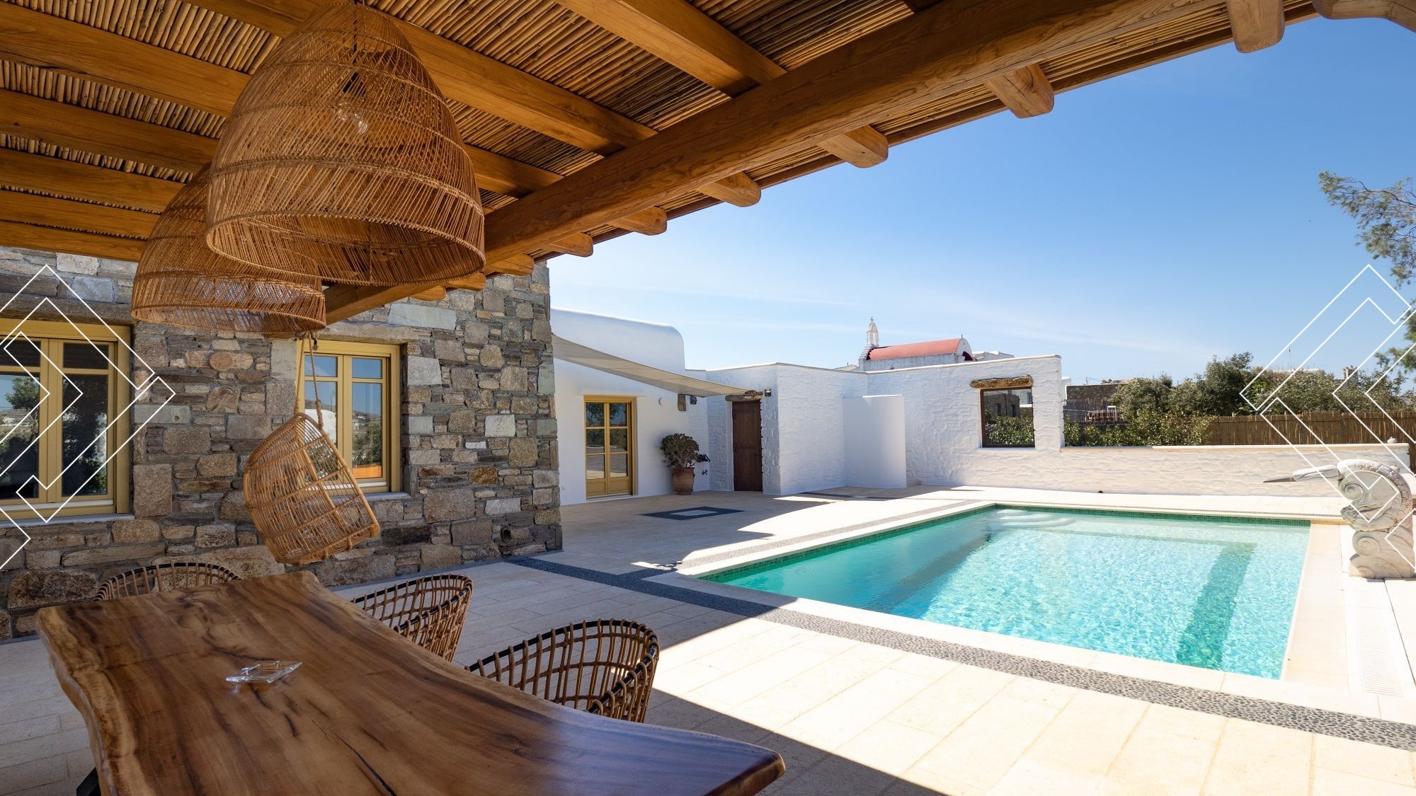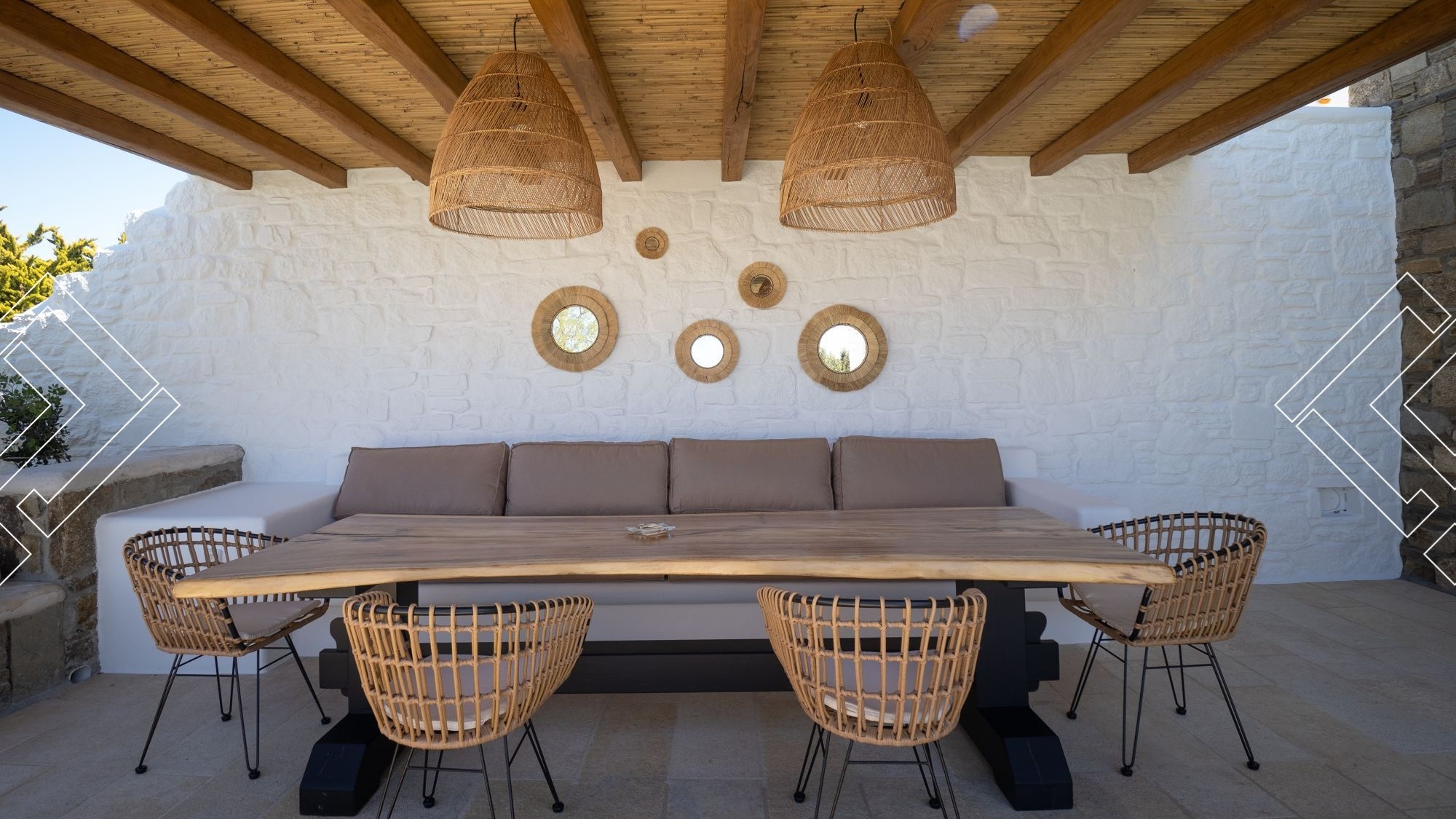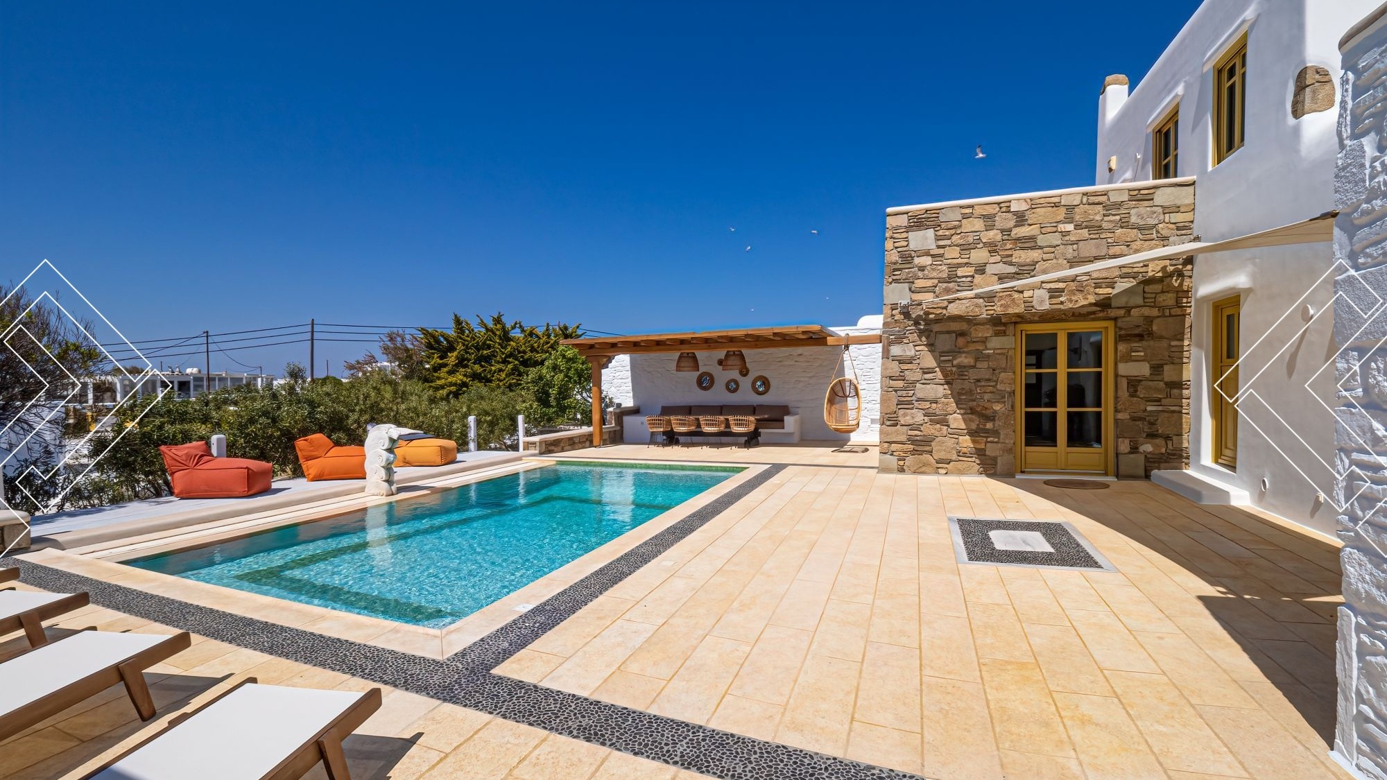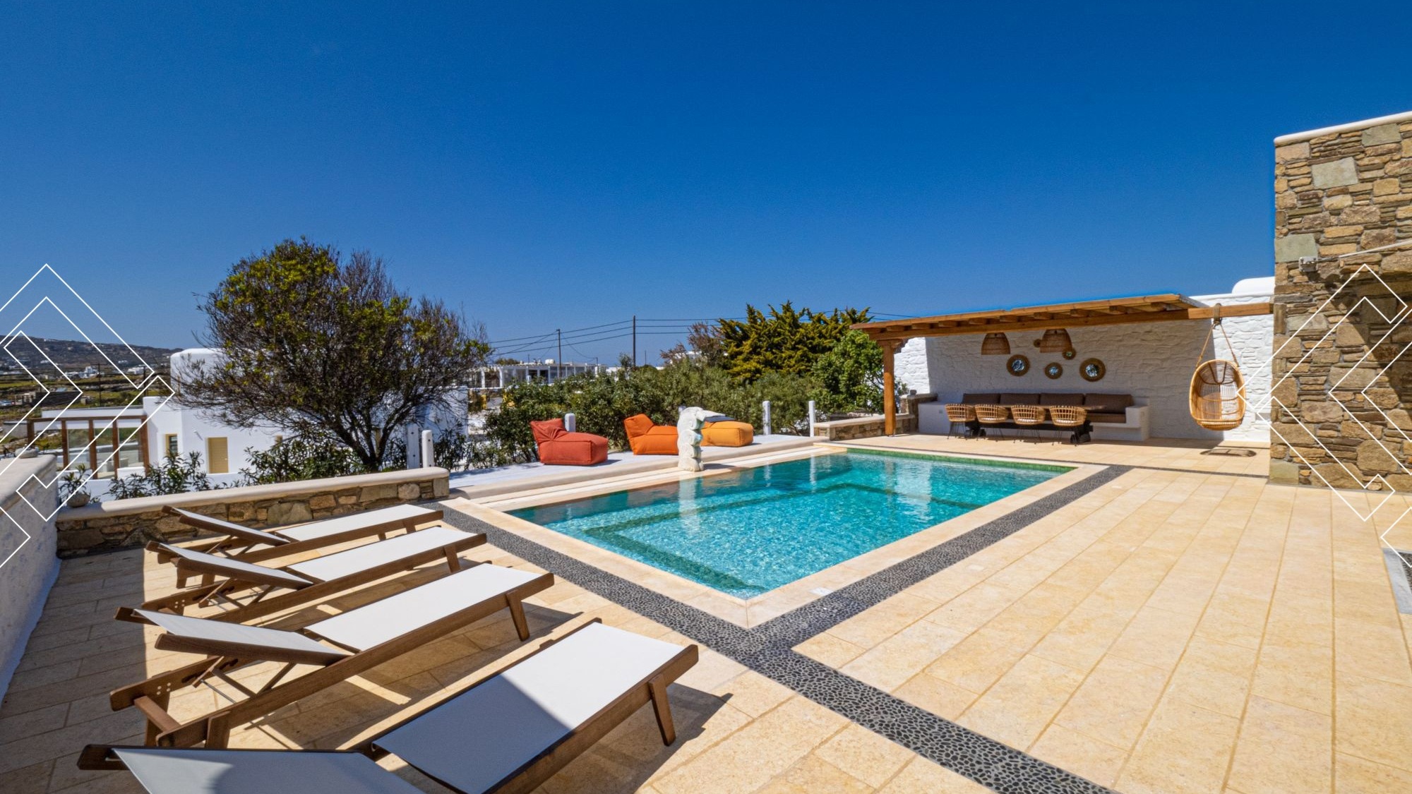 Villa Earth is located in Ornos, just a few minutes from Ornos Beach, 7km from the Port, 3km from the Mykonos Centre, and 3km from the Airport.