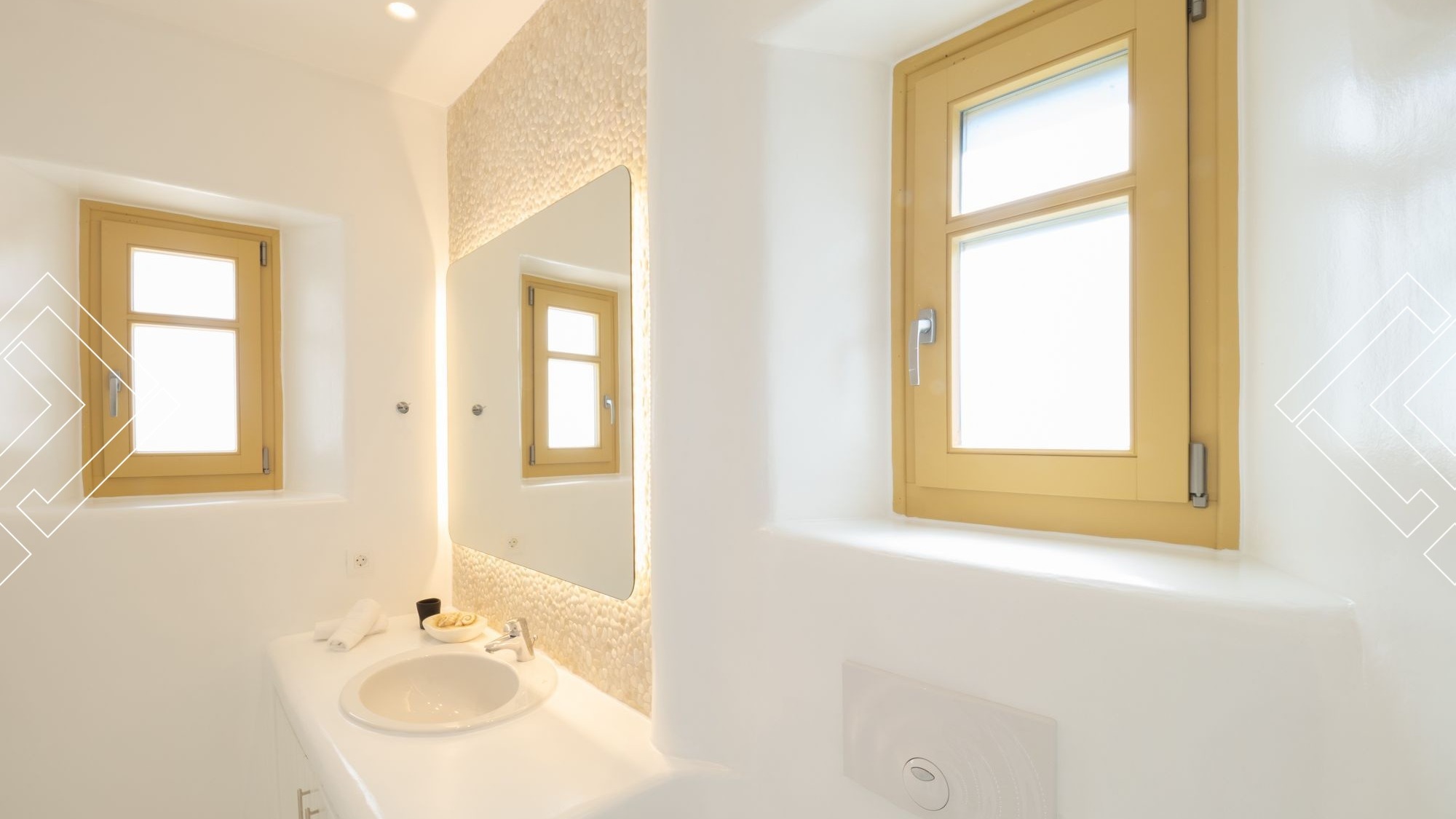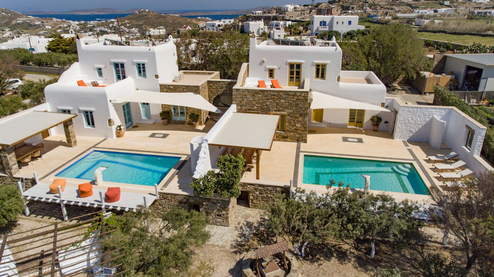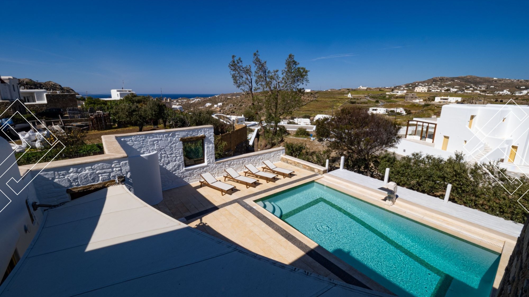 Villa Earth is a serene, newly built villa 100qm, that features a private pool. It can accommodate 4 people, with 2 bedrooms and 2 bathrooms and a WC. Villa Earth is part of a two-villa complex, sister to Villa Sky right next to it.