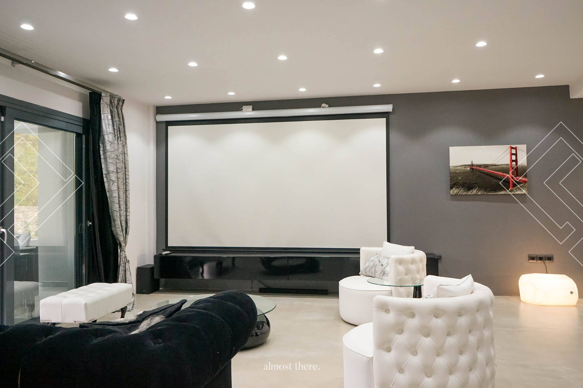 On the ground floor, a luxurious indoor pool with an integrated jacuzzi and a ceiling-based waterfall can offer you moments of happiness and relaxation. At the same level, you can also find the sauna area, some sports equipment, and direct access to the outdoor swimming pool and bbq area. On the first floor, you will find the minimalistic living room with a large 70′ Smart TV Screen, 2 master bedrooms, 4 bathrooms, a dining area, a cinema room, a kitchen, and a guest’s room.