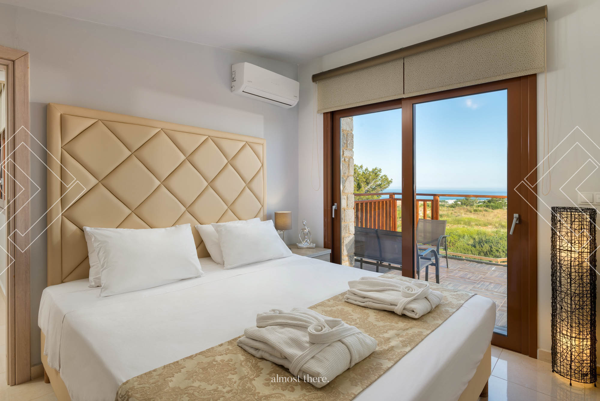 On the ground floor of Villa Ovedius III, you will find an open-plan living/dining/kitchen area. Also, on the ground floor, there is a bathroom and a bedroom with a king-size bed. Moreover, The interior design of this property has earthy tones combined with elements of Greek beauty such as stone and wood. Its comfortable furnishings and the fireplace create a cozy “modern cottage” style creating a welcoming atmosphere. In addition, the ground floor offers direct access to an outdoor veranda and its BBQ area that overlooks the outdoor swimming pool and the lawn area.