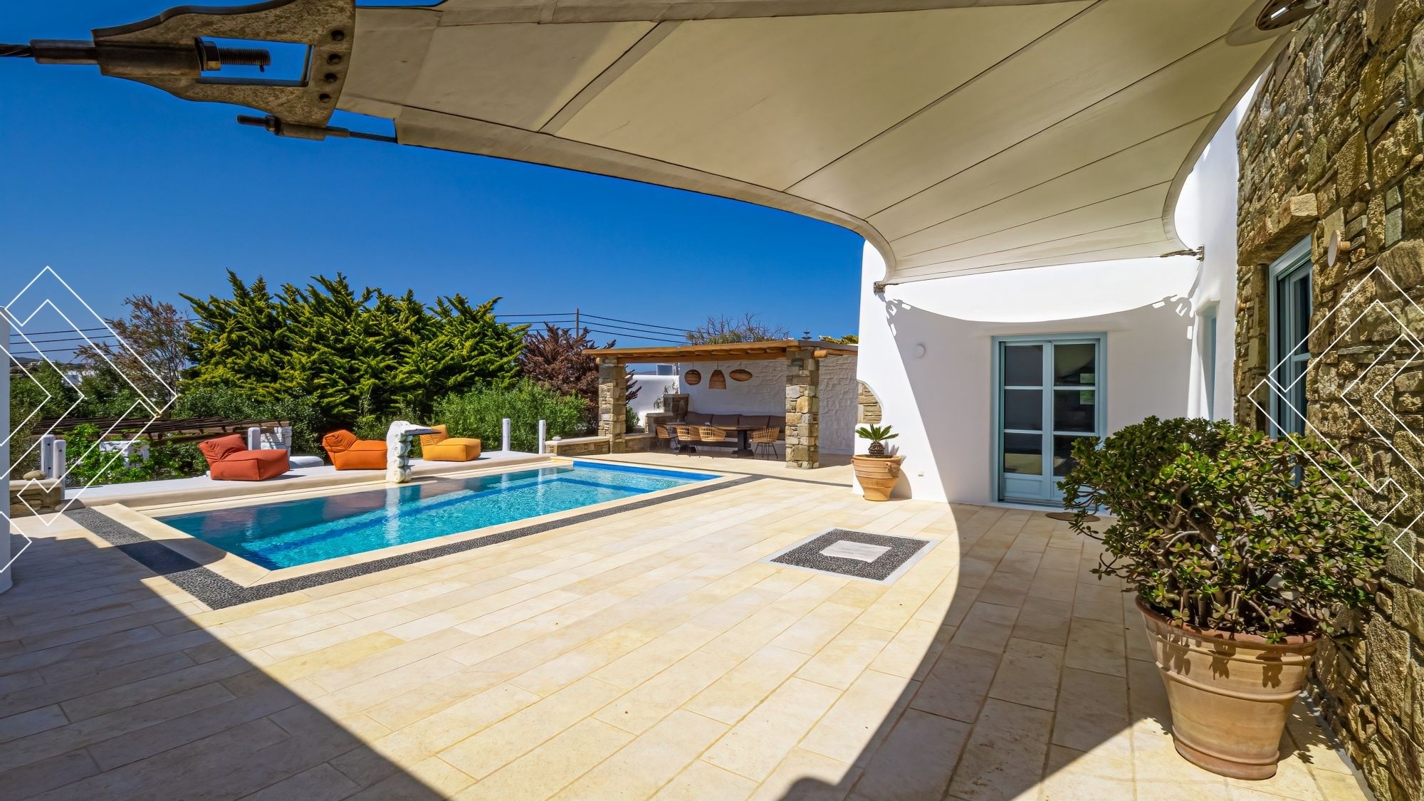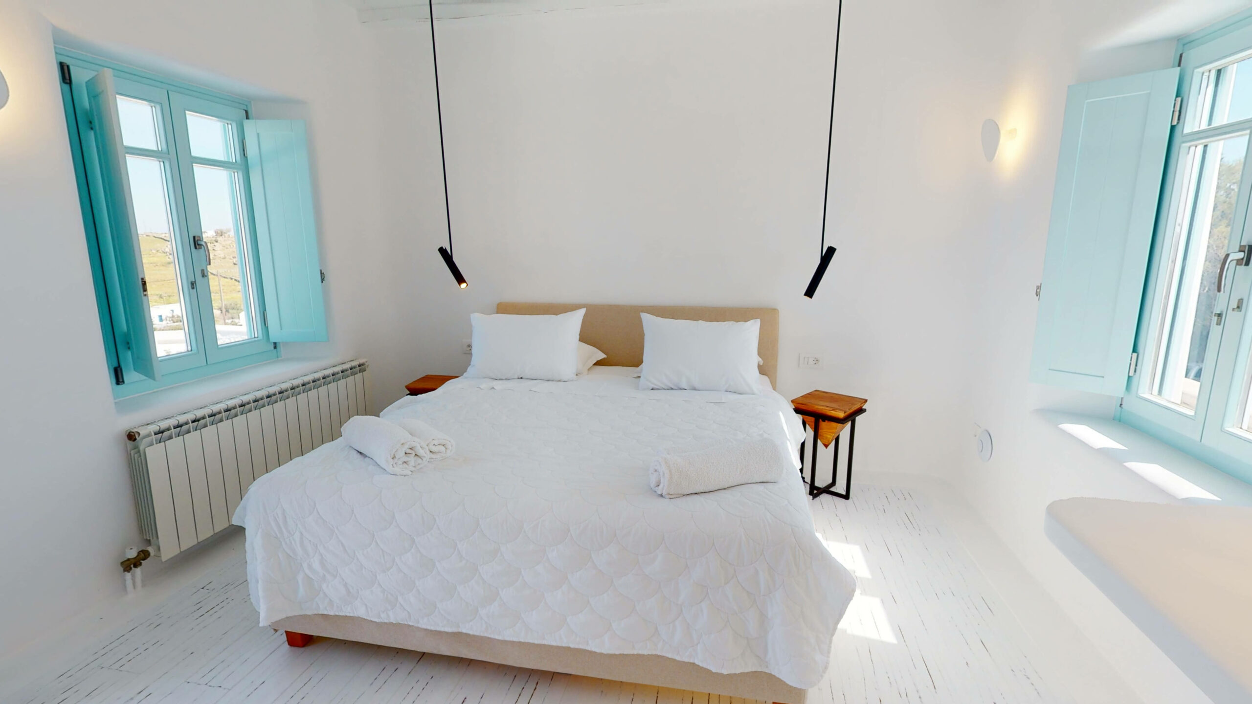 Villa Sky is a serene, newly built villa 100qm, that features a private pool. It can accommodate 4 people, with 2 bedrooms and 2 bathrooms and a WC. Villa Sky is part of a two-villa complex, sister to Villa Sky right next to it.