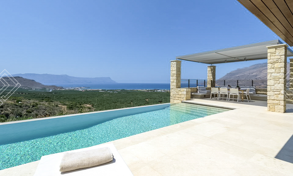 This private villa enjoys a privileged hillside position overlooking the stunning Gramvousa peninsula and the turquoise waters of Kissamos Bay and is surrounded by lush olive groves.