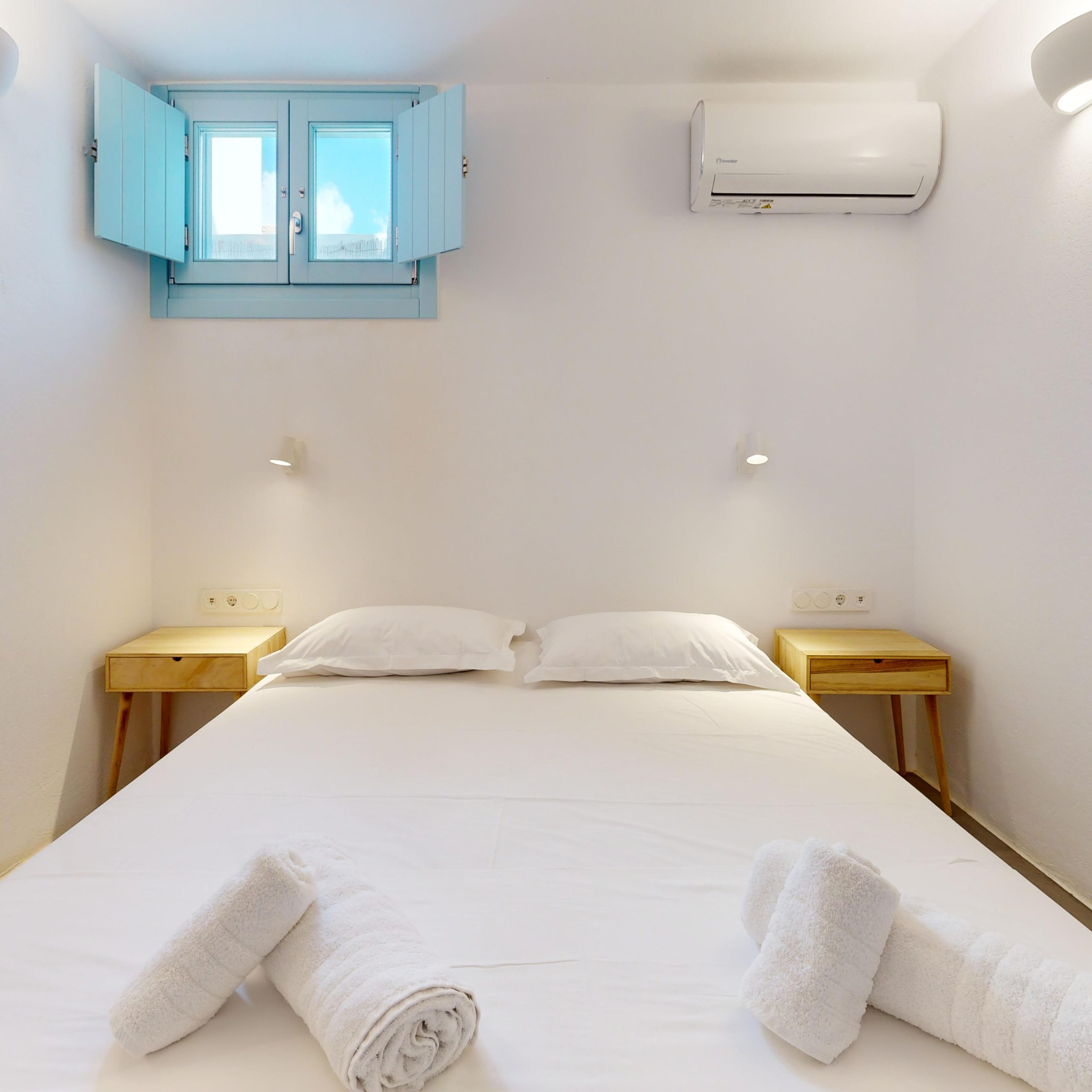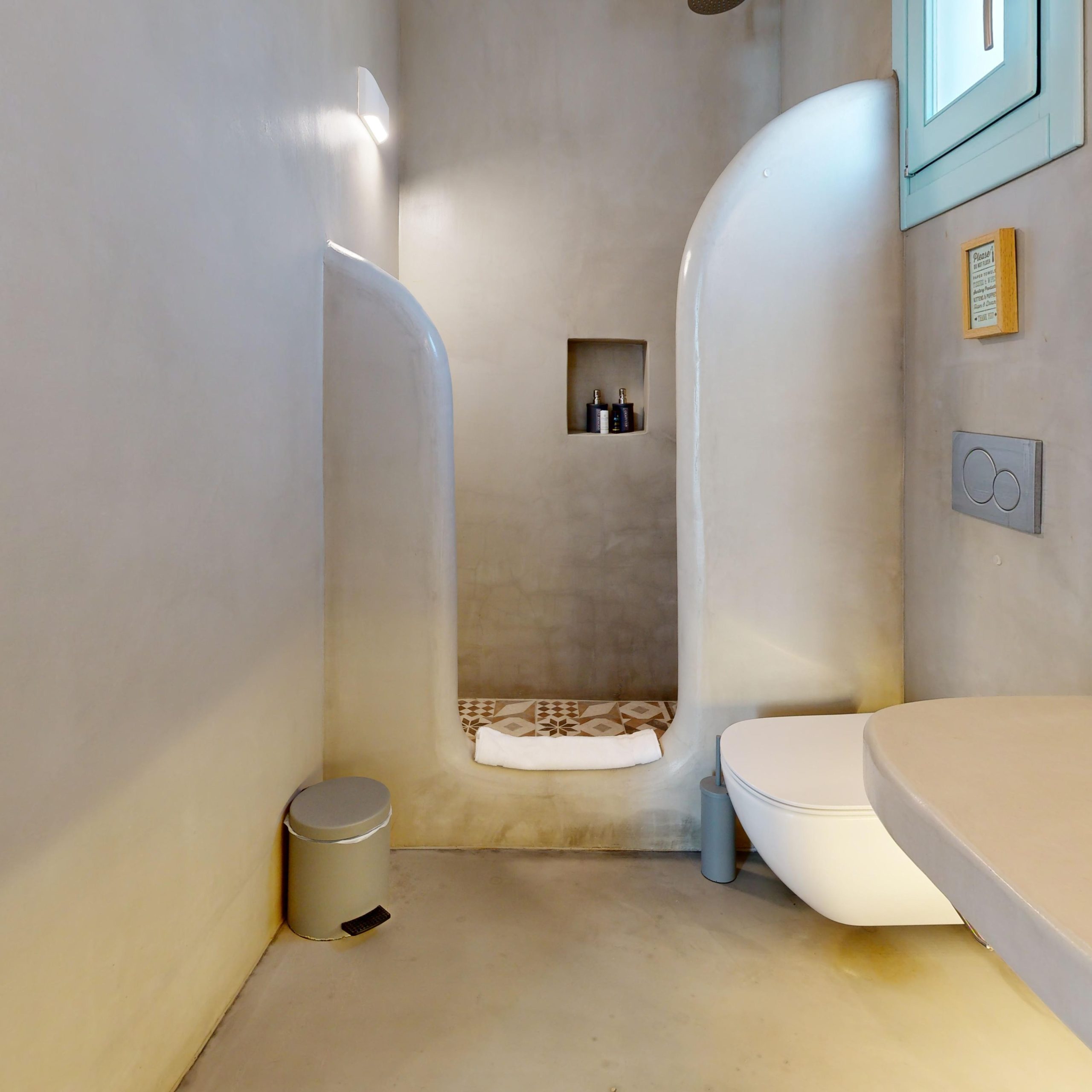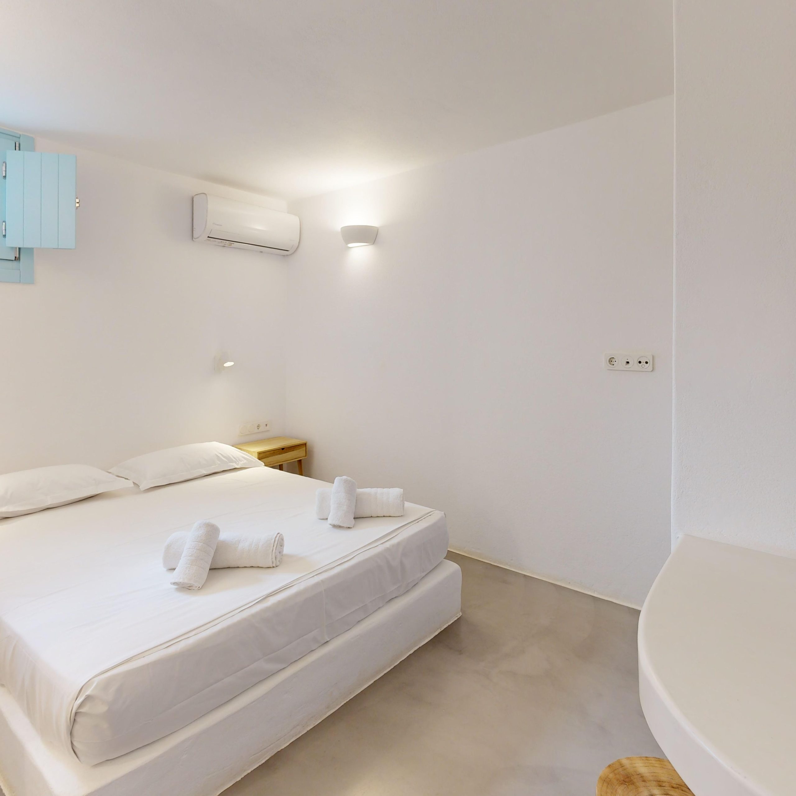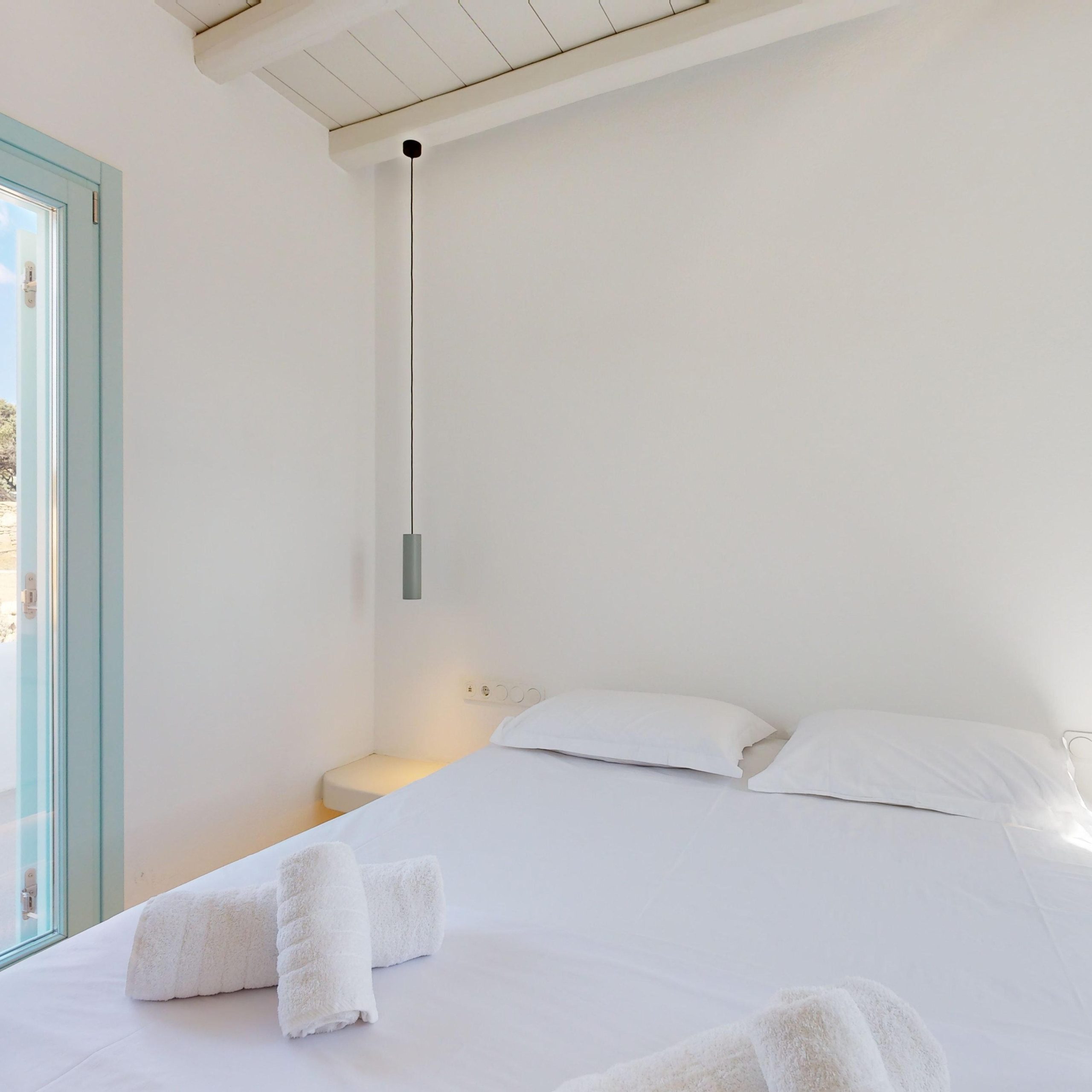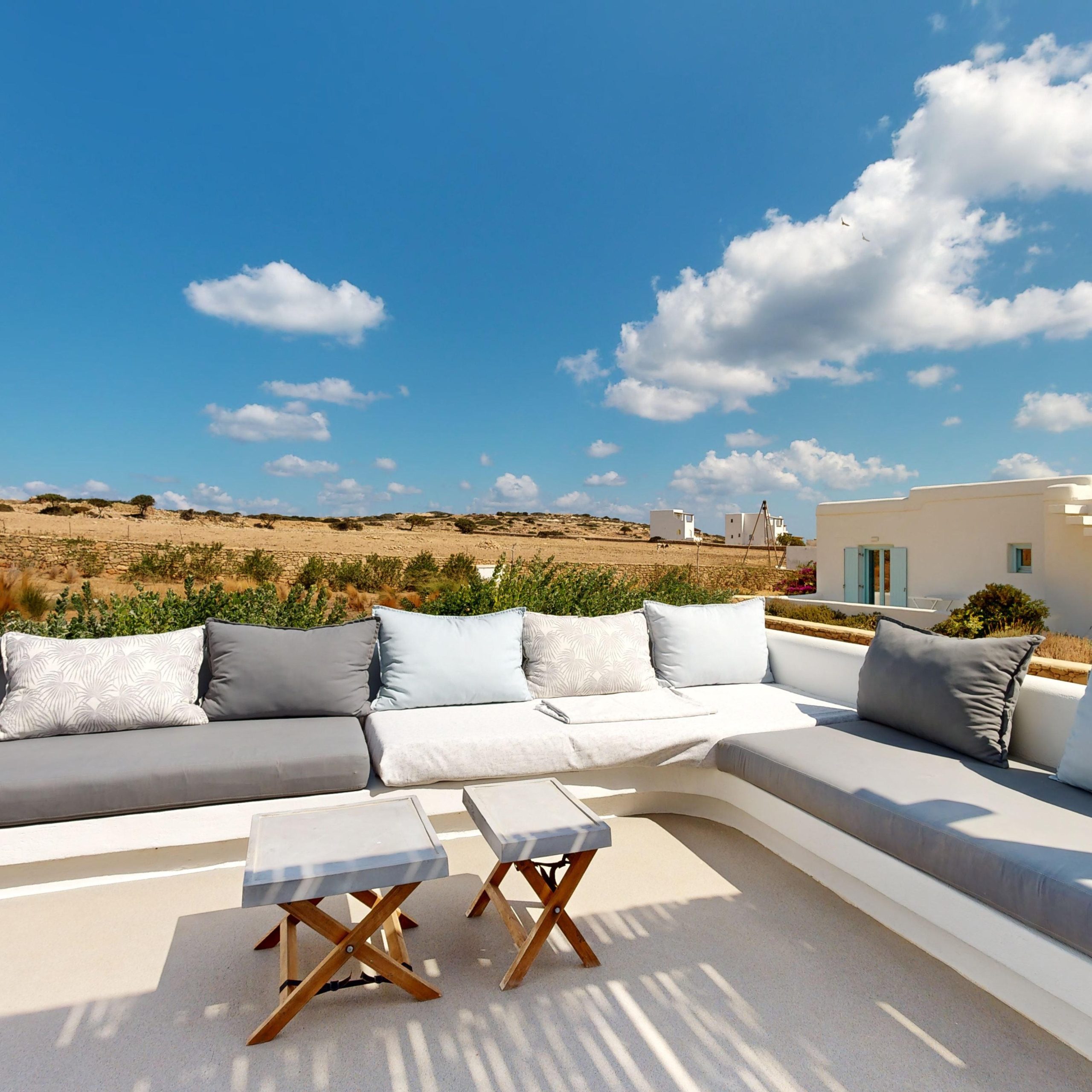 The lower floor features a serene bedroom with a king-size bed and an ensuite bathroom, offering privacy and comfort. Villa Zephyros includes a balcony with a dining table and a large sofa bed, ideal for relaxing and sunbathing. Additionally, a private terrace provides an enchanting spot for stargazing, free from any surrounding lights.